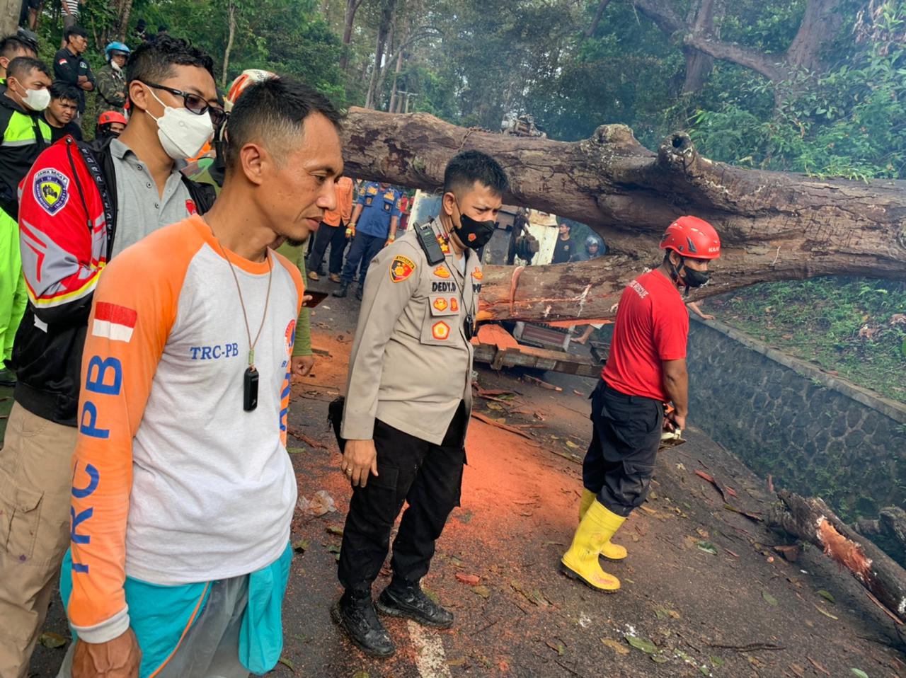 “Kapolres Sukabumi Polda Jabar bersama anggota, tim BPBD Kabupaten Sukabumi, anggota Koramil, Tim SAR dan warga masyarakat lainnya berusaha mengeluarkan para korban dari dalam kendaraan yang ringsek akibat tertimpa pohon tumbang, patut diacungi jempol.” tutur Ibrahim Tompo.