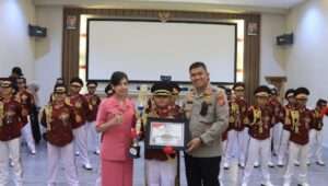Fakta reformasi,- Kapolres Sukabumi Polda Jabar AKBP Maruly Pardede memberikan apresiasi dan penghargaan kepada tim Polisi Cilik Polres Sukabumi Polda Jabar yang berprestasi sebagai Juara Tiga Lomba Polisi Cilik Tingkat Polda Jabar di Mapolres Sukabumi, Palabuhanratu, Jumat (16/6/23).