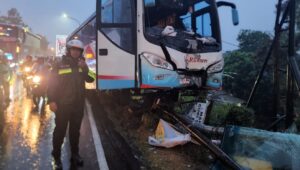 Sebuah bus alami Kecelakaan lalu lintas di Jalan Raya Puncak, Selarong Bawah,desa Cipayung Kecamatan Megamendung, Kabupaten Bogor, pada Minggu 28 Agustus 2023.
