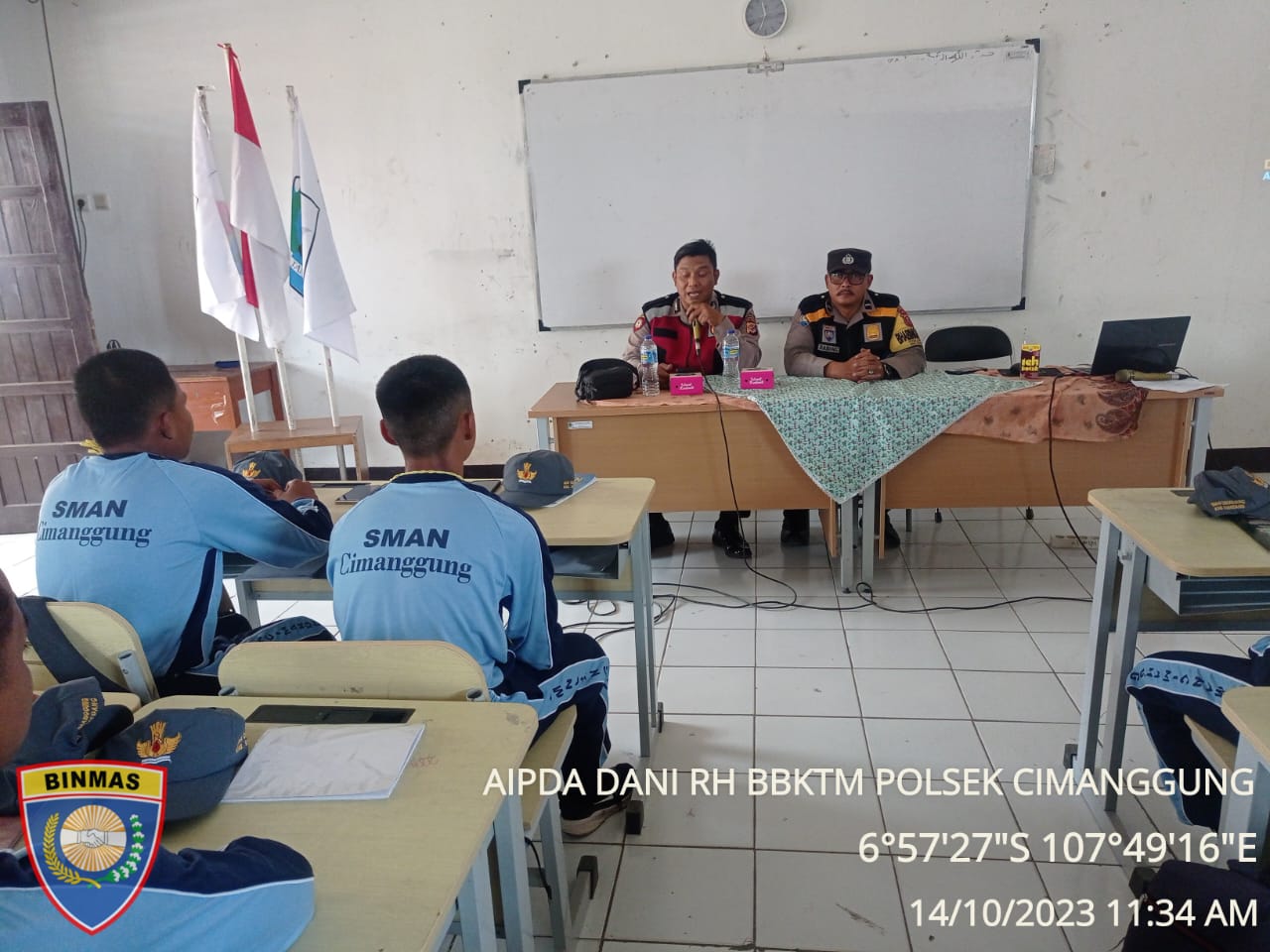 Cimanggung_Sumedang. Bertempat di SMAN Cimanggung Desa Cihanjuang Kec. Cimanggung Kab. Sumedang, Bhabinkamtibmas Polsek Cimanggung Polres Sumedang Polda Jabar Aipda Dani RH beserta Panit 3 Samapta Aipda Agus Telah melaksanakan giat Binlat(Bimbingan dan latihan) Kepramukaan Saka Bhayangkara dan sekaligus himbauan kepada para siswa siswi SMAN Cimanggung dalam rangka Antisipasi Bullying /Perundungan mencegah kenakalan remaja dilingkungan sekolah. Sabtu (14/10/2023).