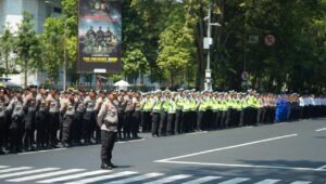 Kapolda Jabar Irjen. Pol. Dr. Akhmad Wiyagus, S.I.K., M.Si., M.M., selaku pimpinan apel gelar pasukan membacakan amanat dari Kapolri yang mengatakan bahwa pemilu 2024 adalah pesta demokrasi terbesar yang akan menjadi bukti kematangan demokrasi indonesia dan sekaligus menjadi titik penentuan masa depan bangsa.