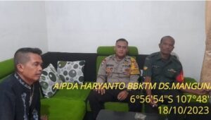 Cimanggung_Sumedang. Bhabinkamtibmas Desa Mangunarga Polsek Cimanggung Polres Sumedang Polda Jabar AIPDA HARYANTO bersama Babinsa Sertu Maman Risadi Melaksanakan giat sambang silaturahmi kepada warga binaan di Dsn ciparuang RT 01 RW 02 desa Mangunarga kecamatan cimanggung kabupaten sumedang. Rabu (18/10/2023).