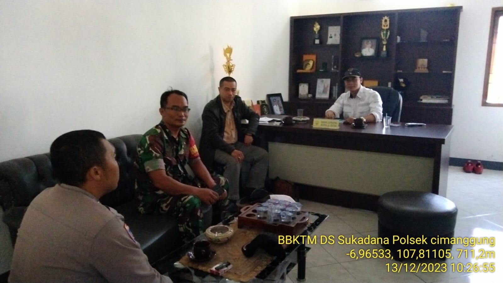Cimanggung_Sumedang. Bhabinkamtibmas Desa Sukadana Polsek Cimanggung polres Sumedang Polda Jabar BRIPKA TRI WIDODO dan Babinsa Sertu Ahmad Nursalam melaksanakan silaturahmi ke kepala desa sukadana dan memberikan Informasi tentang pemilu tahun 2024 Ds Sukadana Kec. Cimanggung Kab. Sumedang. Rabu (13/12/2023).