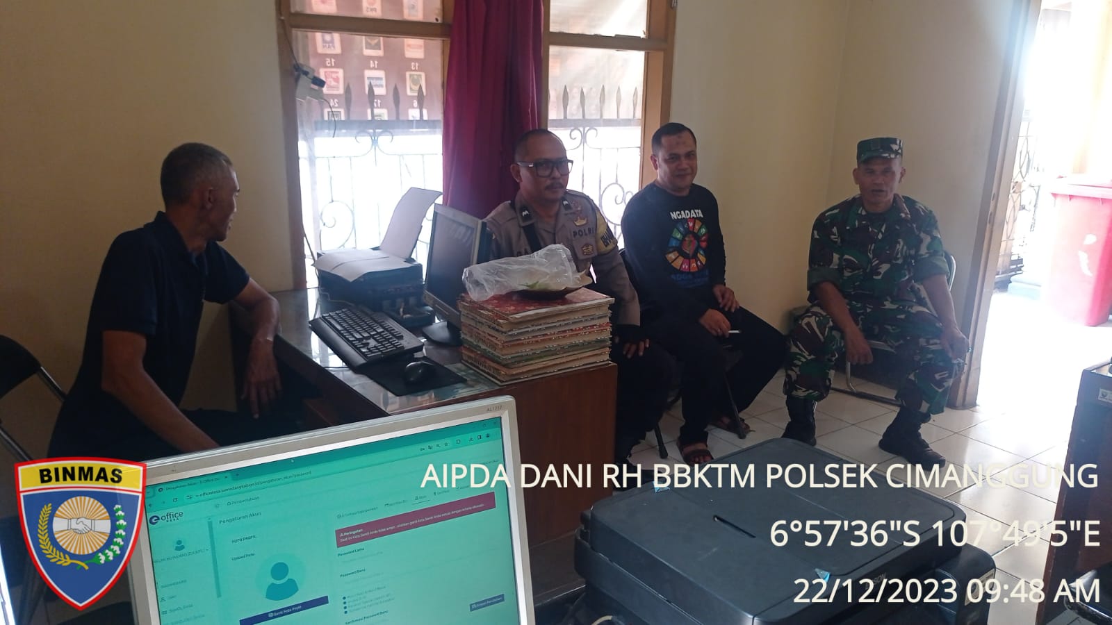 Cimanggung_Sumedang. Bertempat di Kantor Desa Cihanjuang Kecamatan Cimanggung Kabupaten Sumedang. Bhabinkamtibmas Desa Cihanjuang Polsek Cimanggung Polres Sumedang Polda Jabar AIPDA DANI RAMDANI. Telah Melaksanakan Kegiatan Sambang Desa dan Sosialisasi Layanan 110 Kepada perangkat Desa dan warga di Desa Binaan Desa Cihanjuang Kec. Cimanggung Kab. Sumedang Dalam Rangka Pelaksanaan Quick Wins Presisi POLRI. Jum’at (22/12/2023).