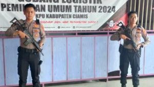 Polres Ciamis Polda Jabar melaksanakan kegiatan pengamanan Gedung logistik KPU Kab. Ciamis. Kegiatan itu bertempat di Gudang logistik KPU Kabupaten Ciamis (Cisadap), Jawa Barat, Rabu (3/1/2024).
