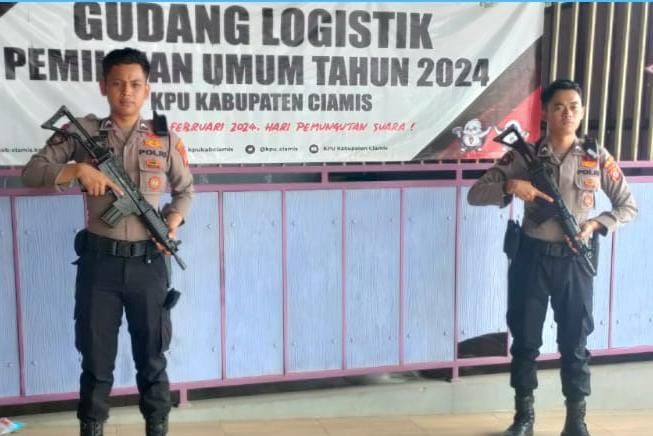 Polres Ciamis Polda Jabar melaksanakan kegiatan pengamanan Gedung logistik KPU Kab. Ciamis. Kegiatan itu bertempat di Gudang logistik KPU Kabupaten Ciamis (Cisadap), Jawa Barat, Rabu (3/1/2024).