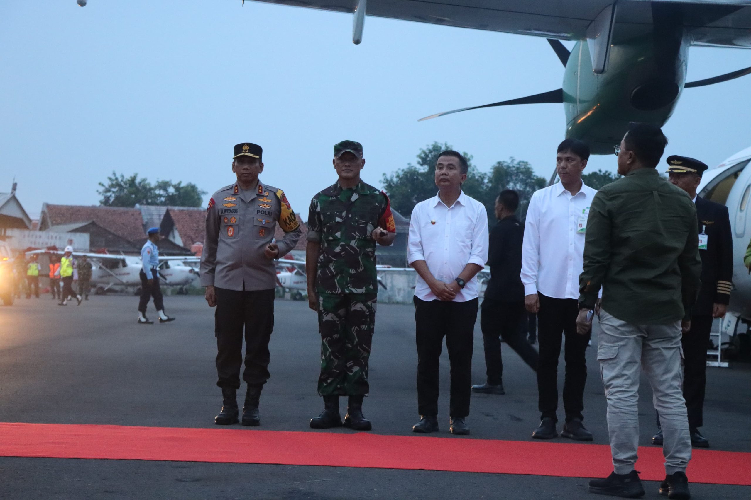 Kapolda Jabar Irjen Pol Dr. Akhmad Wiyagus, S.I.K.,M.Si.,M.M menyambut kedatangan Presiden RI Joko Widodo dan Ibu Iriana beserta rombongan di Bandara Cakrabhuwana Penggung Kota Cirebon, Rabu (3/1/2024).