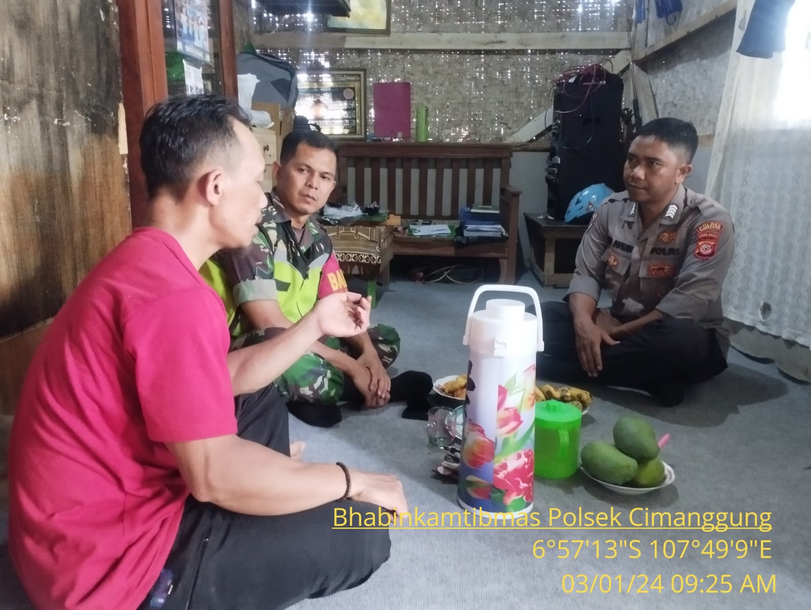 Cimanggung_Sumedang. Bhabinkamtibmas Desa Tegalmanggung Polsek Cimanggung Polres Sumedang Polda Jabar Bripka Asep Sopandi dan Babinsa Sertu Engkus Kusmana melaksanakan kegiatan Sambang ke Tokoh masyarakat Dusun Cilaku Rw 03 Desa Tegqlmanggung Kecamatan cimanggung Kabupaten Sumedang. Rabu (03/01/2024).