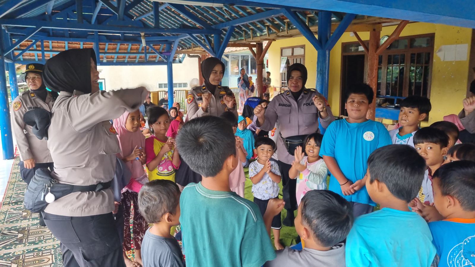 Tim Trauma Healing Polwan Polres Subang Polda Jabar juga memberikan Semangat berupa motivasi dan Hiburan kepada Ibu-ibu Korban Bencana Alam Tanah Longsor untuk menghilangkan rasa Trauma mereka.
