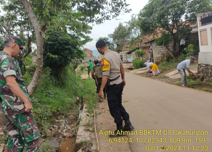 Cimanggung_Sumedang. Bertempat di Dusun sindangnangoh rt. 01 rw 08 Desa Cikahuripan Kecamatan Cimanggung Kabupaten Sumedang. Bhabinkamtibmas Desa Cikahuripan Polsek Cimanggung Polres Sumedang Polda Jabar AIPTU AHMAD SUBEKTI bersama Babinsa SERKA DEDI FIRMANSYAH melaksanakan kerjabakti membersihkan saluran air senjang jaln dri jaln dsn sindangnangoh RW 08 desa Cikahuripan kecamatan cimanggung Kabupaten sumedang bersama warga bergotong royong membersihkannsaluran air dan gorong yang tersumbat sampah membuat air meluap kejalan mengakibatkan jalan ruksak dan mengganggu aktifitas warga pada waktu hujan lebat. Selasa (03/12/2024). Warga bersama aparatur bersama sama untuk membersikan dan membatu membersiakan lumpur yang masuk ke rumah dan berserakan di jalan raya. Dapat mendata warga yang kena musibah banjir dan situasi aman kondusif.(Lia/Humas Polsek Cimanggung)
