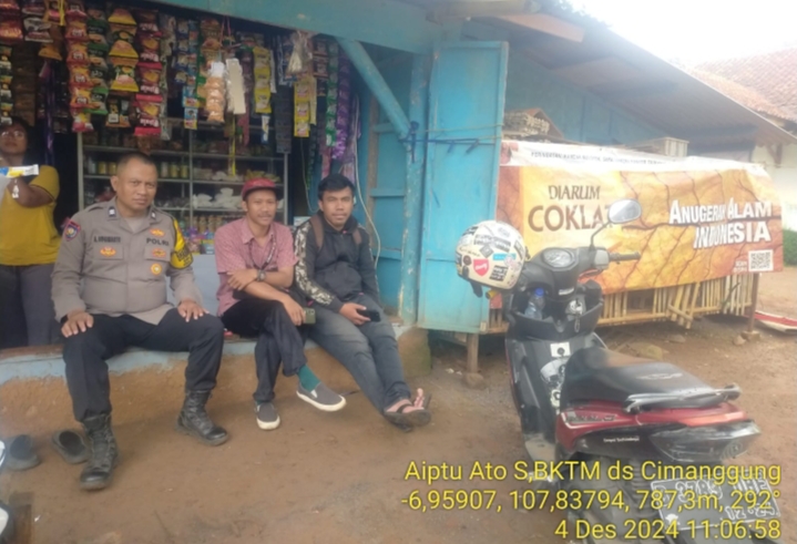 Cimanggung_Sumedang. Dalam rangka mempererat tali silaturahmi antara warga masyarakat binaan dengan bhabinkamtibmas Desa Cimanggung Polsek Cimanggung Polres Sumedang Polda Jabar AIPDA ATO SUGIARTO melaksanakan giat sambang ke warga Desa Cimanggung Kecamatan Cimanggung Kabupaten Sumedang. Rabu (04/12/2024). Kegiatan tersebut di laksanakan untuk berperan aktif membantu dan menjaga situasi kamtibmas di Desa Cimanggung Kecamatan Cimanggung Kabupaten Sumedang.Kapolres Sumedang AKBP JOKO DWI HARSONO, S.I.K., M.Hum. beserta Wakapolres Sumedang KOMPOL MEILAWATY, S.H., S.I.K., M.M. melalui kapolsek Cimanggung KOMPOL KARYAMAN D., S.H., M.H. mengatakan ”Anggota bhabinkamtibmas Desa Cimanggung Polsek Cimanggung Polres Sumedang Polda Jabar melaksanakan kegiatan rutin sambang sekaligus silaturahmi agar mendekatkan diri kepada warga masyarakat wilayah desa Cimanggung.”“Selain itu anggota bhabinkamtibmas juga wajib memberikan pengarahan dan edukasi kamtibmas,mempererat Tali silaturahmi, menyampaikan pesan kamtibmas, monitoring situasi kamtibmas, monitoring penerapan prokes dan mengajak warga masyarakat untuk senantiasa menjaga kondusifitas dan keamanan di lingkungannya masing-masing,” Pungkas Kapolsek Cimanggung.(Lia/Humas Polsek Cimanggung)