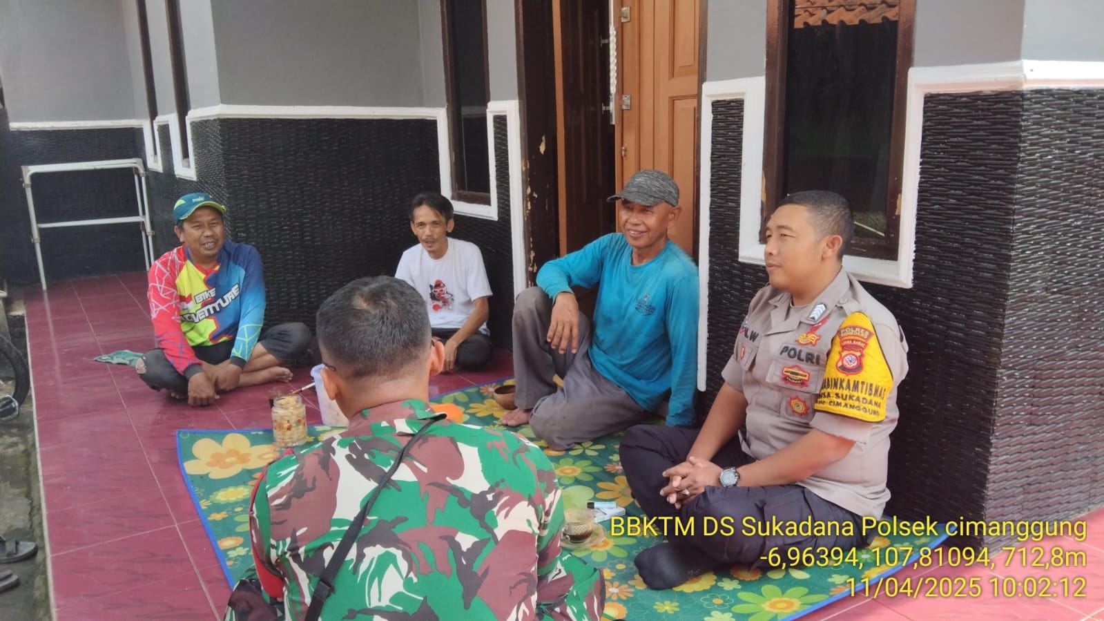 Cimanggung_Sumedang. Bhabinkamtibmas Desa Sukadana Polsek Cimanggung Polres Sumedang Polda Jabar BRIPKA TRI WIDODO dan Babinsa SERTU ACHMAD NURSALAM telah melaksanakan kegiatan sambang dan silaturahmi kamtibmas kepada warga binaan Dalam rangka pelaksanaan BEYOND TRUST PRESISI. Jum’at (11/04/2025). Adapun dalam kegiatan silaturahmi kamtibmas tersebut Bhabinkamtibmas menyampaikan pesan – pesan Kamtibmas kepada lingkungan sekitar, antara lain : • _Agar masyarakat bisa menjaga kesehatan dengan selalu berolahraga dan makan makanan bergizi_ – _Selalu menjaga keamanan dan ketertiban dilingkungan_- _Antisipasi lingkungan warga sekitar terutama yang rawan bencana alam banjir, tanah longsor , kebakaran lahan kosong dan pohon tumbang._- _Apabila ada kejadian atau hal hal yang penting segera melaporkan kepada Polsek terkait, Kepala Desa, Bhabinkamtibmas dan Babinsa._- _Bijak menggunakan media sosial dan filter terkait berita Hoax._Kegiatan berjalan aman dan lancar serta terjalinnya silaturahmi dan bersinergi antara warga masyarakat dengan pihak Polri.(Lia/Humas Polsek Cimanggung)