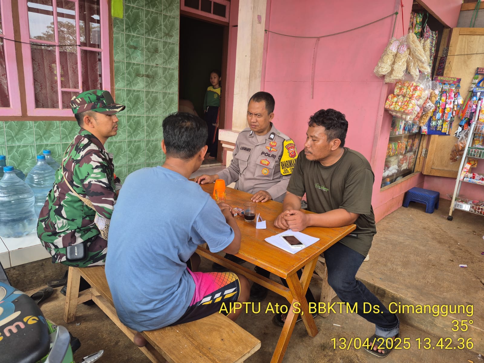 Cimanggung_Sumedang. Bhabinkamtibmas Desa Cimanggung Polsek Cimanggung Polres Sumedang Polda Jabar AIPTU ATO SUGIHARTO dan Babinsa SERKA FAJAR telah melaksanakan kegiatan sambang dan silaturahmi kamtibmas kewarga binaan Dalam rangka pelaksanaan BEYOND TRUST PRESISI. Minggu (13/04/2025). Adapun dalam kegiatan silaturahmi kamtibmas tersebut Bhabinkamtibmas menyampaikan pesan – pesan Kamtibmas kepada lingkungan sekitar, antara lain : • _Agar masyarakat bisa menjaga kesehatan dengan selalu berolahraga dan makan makanan bergizi_ – _Selalu menjaga keamanan dan ketertiban dilingkungan_- _Antisipasi lingkungan warga sekitar terutama yang rawan bencana alam banjir, tanah longsor , kebakaran lahan kosong dan pohon tumbang._- _Apabila ada kejadian atau hal hal yang penting segera melaporkan kepada Polsek terkait, Kepala Desa, Bhabinkamtibmas dan Babinsa._- _Bijak menggunakan media sosial dan filter terkait berita Hoax._Kegiatan berjalan aman dan lancar serta terjalinnya silaturahmi dan bersinergi antara warga masyarakat dengan pihak Polri.(Lia/Humas Polsek Cimanggung)
