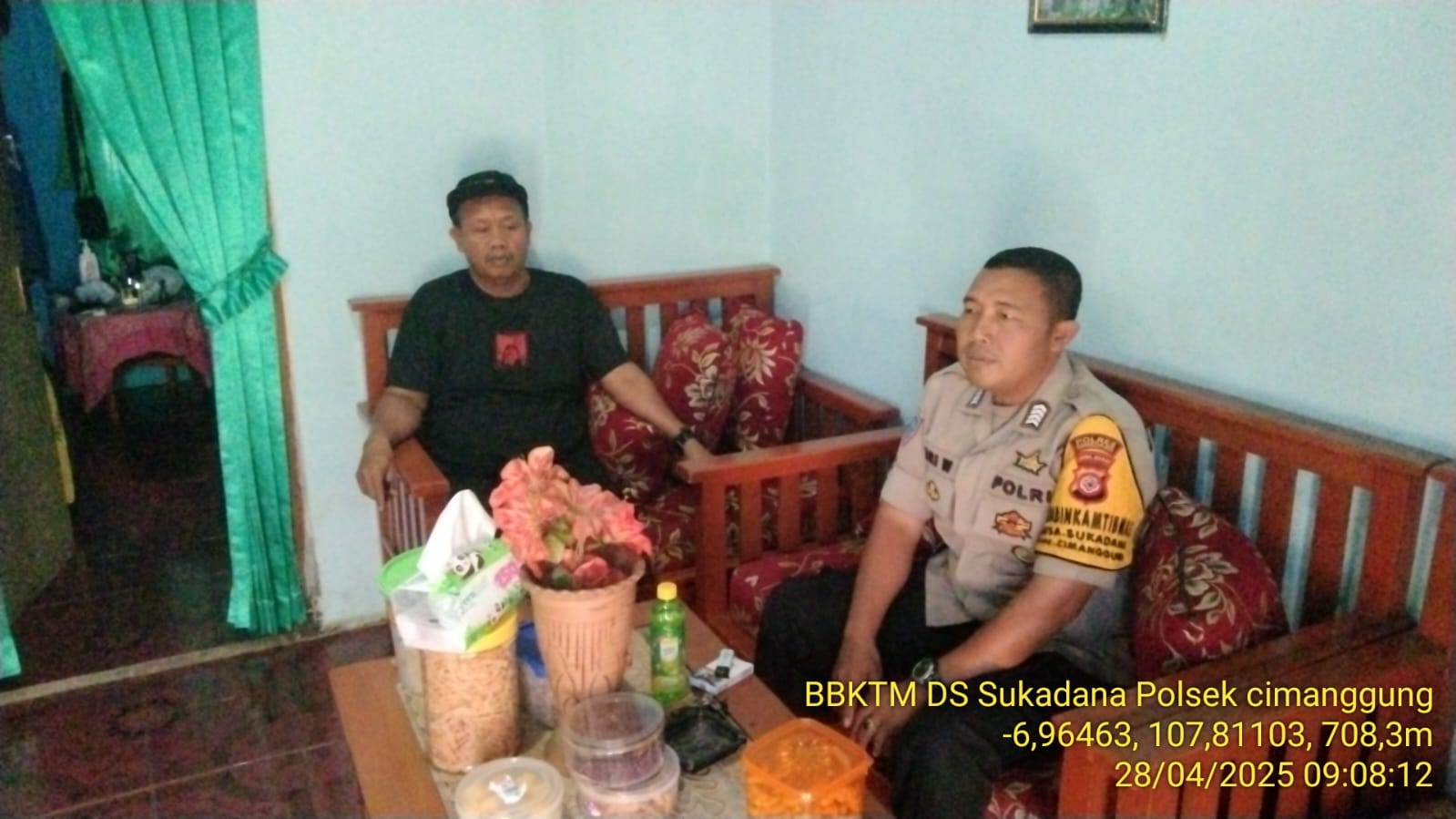 Cimanggung_Sumedang. Dalam rangka mempererat tali silaturahmi antara warga masyarakat binaan dengan bhabinkamtibmas Desa Sukadana Polsek Cimanggung Polres Sumedang Polda Jabar BRIPKA TRI WIDODO melaksanakan giat sambang ke warga Desa Sukadana Kecamatan Cimanggung Kabupaten Sumedang. Senin (28/04/2025). Kegiatan tersebut di laksanakan untuk berperan aktif membantu dan menjaga situasi kamtibmas di Desa Sukadana Kecamatan Cimanggung Kabupaten Sumedang.Kapolresta Sumedang AKBP JOKO DWI HARSONO, S.I.K., M.Hum. melalui kapolsek Cimanggung KOMPOL KARYAMAN D., S.H., M.H. mengatakan ”Anggota bhabinkamtibmas Desa Sukadana Polsek Cimanggung Polres Sumedang Polda Jabar melaksanakan kegiatan rutin sambang sekaligus silaturahmi agar mendekatkan diri kepada warga masyarakat wilayah desa Sukadana.”“Selain itu anggota bhabinkamtibmas juga wajib memberikan pengarahan dan edukasi kamtibmas,mempererat Tali silaturahmi, menyampaikan pesan kamtibmas, monitoring situasi kamtibmas, monitoring penerapan prokes dan mengajak warga masyarakat untuk senantiasa menjaga kondusifitas dan keamanan di lingkungannya masing-masing,” Pungkas Kapolsek Cimanggung.(Lia/Humas Polsek Cimanggung)