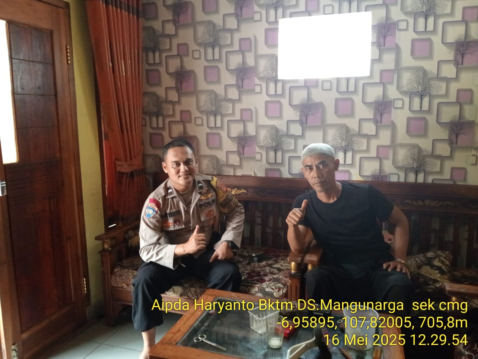 Cimanggung_Sumedang. Dalam rangka mempererat tali silaturahmi antara warga masyarakat binaan dengan bhabinkamtibmas Desa Mangunarga AIPDA HARYANTO melaksanakan giat sambang ke warga Desa Mangunarga Kecamatan Cimanggung Kabupaten Sumedang. Jum’at (16/05/2025). Kegiatan tersebut di laksanakan untuk berperan aktif membantu dan menjaga situasi kamtibmas di Desa Mangunarga Kecamatan Cimanggung Kabupaten Sumedang.Kapolresta Sumedang AKBP JOKO DWI HARSONO, S.I.K., M.Hum. melalui kapolsek Cimanggung KOMPOL KARYAMAN D., S.H., M.H. mengatakan ” Anggota bhabinkamtibmas Desa Mangunarga melaksanakan kegiatan rutin sambang sekaligus silaturahmi agar mendekatkan diri kepada warga masyarakat wilayah desa Mangunarga.“Selain itu anggota bhabinkamtibmas juga wajib memberikan pengarahan dan edukasi kamtibmas,mempererat Tali silaturahmi, menyampaikan pesan kamtibmas, monitoring situasi kamtibmas, monitoring penerapan prokes dan mengajak warga masyarakat untuk senantiasa menjaga kondusifitas dan keamanan di lingkungannya masing-masing,” Pungkas Kapolsek Cimanggung.(Lia/Humas Polsek Cimanggung)