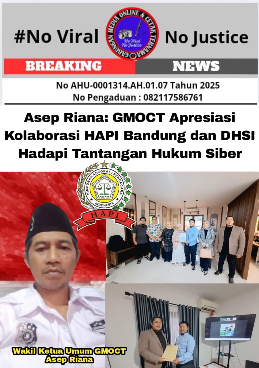 BANDUNG (GMOCT) – Wakil Ketua Umum Gabungan Media Online dan Cetak Ternama (GMOCT) dan bagian dari Bidang IT Himpunan Advokasi Pengacara Indonesia (HAPI) Jawa Barat, Asep Riana, memberikan apresiasi tinggi terhadap kolaborasi strategis antara Himpunan Advokat/Pengacara Indonesia (HAPI) DPC Kota Bandung dan Dewan Hukum Siber Indonesia (DHSI). Kerja sama ini diresmikan melalui penandatanganan nota kesepahaman (MoU) di Hotel Dharmawangsa, Jakarta Selatan, Senin (19/5).