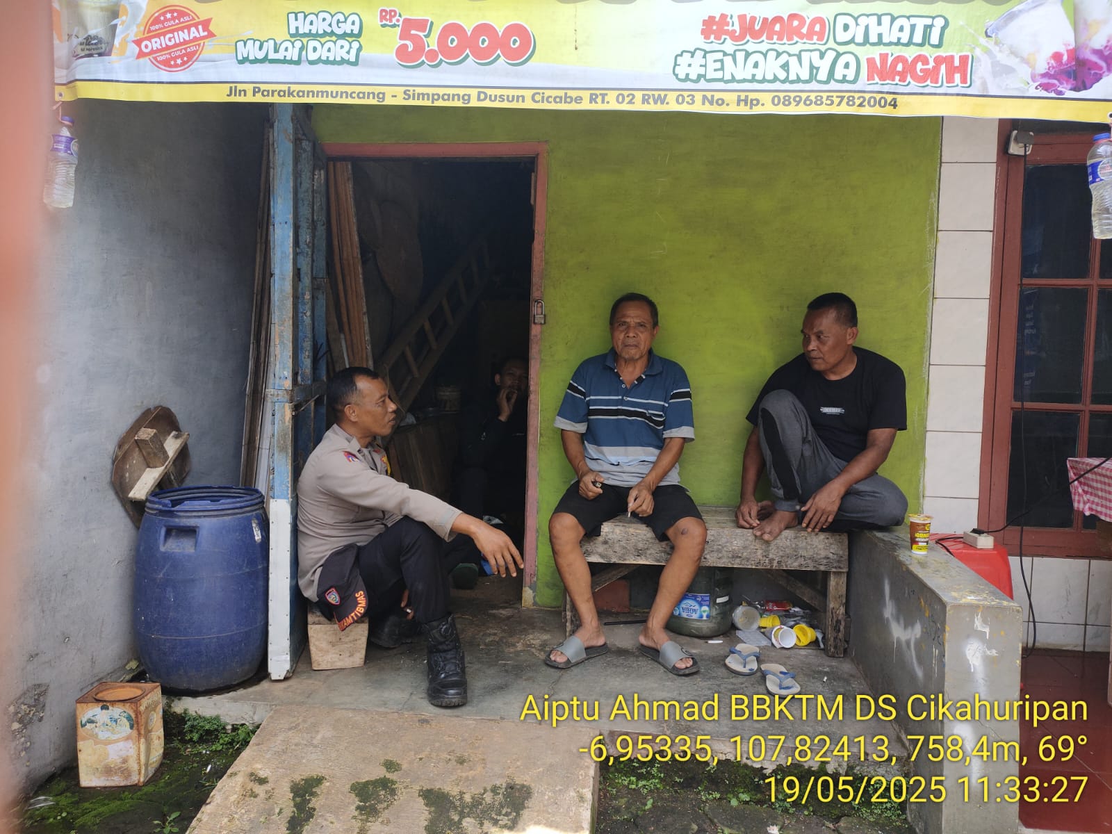 Cimanggung-Sumedang. Bhabinkamtibmas Desa Cikahuripan Polsek Cimanggung Polres Sumedang Polda Jabar AIPTU AHMAD SUBEKTI laksanakan sambangi warga dusun Cikadaton guna monitoring keamanan dan ketertiban masyarakat. Senin (19/05/2025). Bhabinkamtibmas Desa Cikahuripan pada pelaksanaan sambang kali ini menyambangi warga Desa Cikahuripan Kecamatan Cimanggung Kabupaten Sumedang yang sedang melaksanaan aktifitas kesehariannya.Pada kesempatan sambang kali ini saat bertemu dengan warga binaan, Bhabinkamtibmas menyampaikan pesan-pesan kamtibmas diantaranya himbauan keamanan dan wajib lapor bagi tamu yang baru datang dan penduduk setempat.Selain itu juga Bhabinkamtibmas menyampaikan kepada warga untuk segera menghubungi dan melaporkan kepada aparat berwenang jika terjadi perkara tindak pidana di wilayahnya.Sementara itu Kapolres Sumedang AKBP JOKO DWI HARSONO, S.I.K., M.Hum. melalui Kapolsek Cimanggung KOMPOL KARYAMAN D., S.H., M.H. menyampaikan bahwa berdasarkan penugasannya para personil Bhabinkamtibmas akan senantiasa memantau perkembangan kamtibmas di wilayah desa binaanya, “pungkasnya(Lia/Humas Polsek Cimanggung)