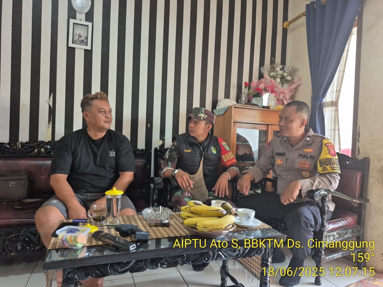 Cimanggung_Sumedang. Dalam rangka mempererat tali silaturahmi antara warga masyarakat binaan dengan bhabinkamtibmas Desa Cimanggung Polsek Cimanggung Polres Sumedang Polda Jabar AIPDA ATO SUGIARTO melaksanakan giat sambang ke warga Desa Cimanggung Kecamatan Cimanggung Kabupaten Sumedang. Rabu (18/06/2025). Kegiatan tersebut di laksanakan untuk berperan aktif membantu dan menjaga situasi kamtibmas di Desa Cimanggung Kecamatan Cimanggung Kabupaten Sumedang.Kapolres Sumedang AKBP JOKO DWI HARSONO, S.I.K., M.Hum. melalui kapolsek Cimanggung KOMPOL KARYAMAN D., S.H., M.H. mengatakan ”Anggota bhabinkamtibmas Desa Cimanggung Polsek Cimanggung Polres Sumedang Polda Jabar melaksanakan kegiatan rutin sambang sekaligus silaturahmi agar mendekatkan diri kepada warga masyarakat wilayah desa Cimanggung.”“Selain itu anggota bhabinkamtibmas juga wajib memberikan pengarahan dan edukasi kamtibmas,mempererat Tali silaturahmi, menyampaikan pesan kamtibmas, monitoring situasi kamtibmas, monitoring penerapan prokes dan mengajak warga masyarakat untuk senantiasa menjaga kondusifitas dan keamanan di lingkungannya masing-masing,” Pungkas Kapolsek Cimanggung.(Lia/Humas Polsek Cimanggung)