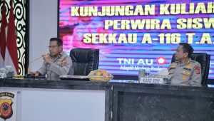 Kepolisian Daerah Jawa Barat menerima kunjungan kehormatan dari para Perwira Siswa Sekolah Komando Kesatuan Angkatan Udara (SEKKAU) Angkatan ke-116 Tahun Ajaran 2025. Kegiatan kuliah kerja ini berlangsung pada Kamis, 19 Juni 2025, bertempat di Aula Direktorat Lalu Lintas Polda Jabar, mulai pukul 10.30 WIB hingga selesai.Kunjungan tersebut disambut hangat oleh Kepala Inspektorat Pengawasan Daerah (Itwasda) Polda Jabar, Brigjen Pol Rinto Prastowo, S.I.K., didampingi oleh Kepala Biro Sumber Daya Manusia (Karo SDM) Polda Jabar, Kombes Pol. Dr. Fadly Samad, S.H., S.I.K., M.H., M.Si.. Dalam sambutannya, Brigjen Pol Rinto menyampaikan apresiasi atas kunjungan ini sebagai bentuk sinergi antar matra dan institusi dalam memperkuat wawasan kebangsaan serta strategi pengembangan sumber daya manusia di bidang pertahanan dan keamanan nasional.”Kunjungan ini menjadi momen penting untuk saling bertukar pengalaman dan perspektif antara TNI AU dan Polri. Diharapkan para Perwira Siswa SEKKAU dapat menggali wawasan praktis dari sisi kepolisian, khususnya dalam manajemen SDM, pengawasan internal, serta pendekatan pelayanan publik yang humanis,” ujar Brigjen Pol Rinto Prastowo.Karo SDM Polda Jabar, Kombes Pol Dr. Fadly Samad, turut memaparkan materi terkait strategi pengelolaan personel Polri di wilayah Jawa Barat, termasuk pengembangan kapasitas personel, sistem rekrutmen berbasis kompetensi, hingga digitalisasi administrasi kepegawaian. Ia menekankan pentingnya integrasi lintas sektoral dalam membentuk aparatur negara yang profesional dan adaptif terhadap tantangan zaman.Kabid Humas Polda Jabar Kombes Pol. Hendra Rochmawan S.I.K., M.H mengatakan bahwa Kegiatan kuliah kerja ini menjadi bagian dari kurikulum SEKKAU untuk memperluas wawasan para perwira TNI AU dalam bidang kepemimpinan, manajerial dan kerja sama antarlembaga negara. Dengan penuh semangat dan antusiasme, para perwira siswa mengikuti sesi diskusi dan tanya jawab yang berlangsung interaktif. Kunjungan ini diakhiri dengan penyerahan cenderamata dan sesi foto bersama, menandai eratnya kolaborasi antara TNI dan Polri dalam membangun kekuatan nasional yang solid dan harmonis.(Lia/Humas Polda Jabar