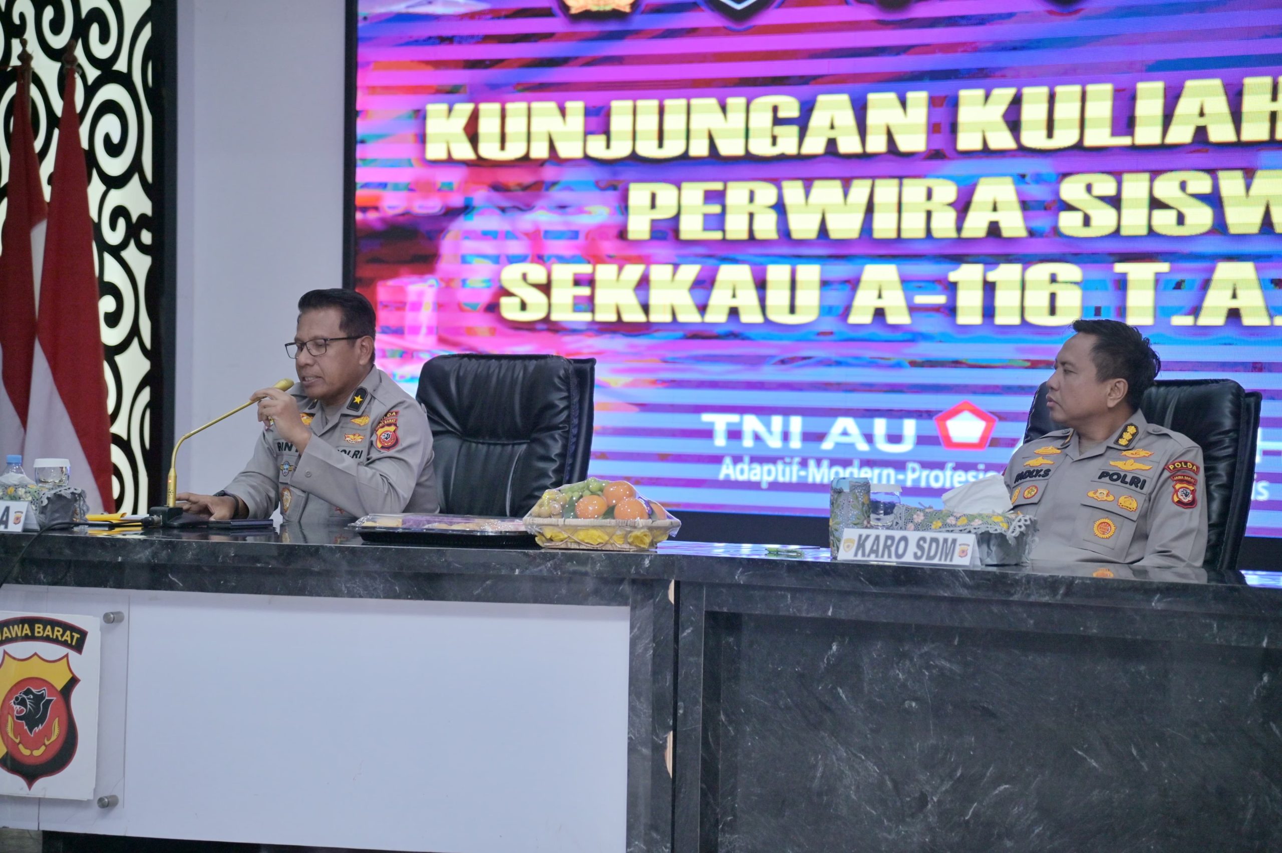 Kepolisian Daerah Jawa Barat menerima kunjungan kehormatan dari para Perwira Siswa Sekolah Komando Kesatuan Angkatan Udara (SEKKAU) Angkatan ke-116 Tahun Ajaran 2025. Kegiatan kuliah kerja ini berlangsung pada Kamis, 19 Juni 2025, bertempat di Aula Direktorat Lalu Lintas Polda Jabar, mulai pukul 10.30 WIB hingga selesai.Kunjungan tersebut disambut hangat oleh Kepala Inspektorat Pengawasan Daerah (Itwasda) Polda Jabar, Brigjen Pol Rinto Prastowo, S.I.K., didampingi oleh Kepala Biro Sumber Daya Manusia (Karo SDM) Polda Jabar, Kombes Pol. Dr. Fadly Samad, S.H., S.I.K., M.H., M.Si.. Dalam sambutannya, Brigjen Pol Rinto menyampaikan apresiasi atas kunjungan ini sebagai bentuk sinergi antar matra dan institusi dalam memperkuat wawasan kebangsaan serta strategi pengembangan sumber daya manusia di bidang pertahanan dan keamanan nasional.”Kunjungan ini menjadi momen penting untuk saling bertukar pengalaman dan perspektif antara TNI AU dan Polri. Diharapkan para Perwira Siswa SEKKAU dapat menggali wawasan praktis dari sisi kepolisian, khususnya dalam manajemen SDM, pengawasan internal, serta pendekatan pelayanan publik yang humanis,” ujar Brigjen Pol Rinto Prastowo.Karo SDM Polda Jabar, Kombes Pol Dr. Fadly Samad, turut memaparkan materi terkait strategi pengelolaan personel Polri di wilayah Jawa Barat, termasuk pengembangan kapasitas personel, sistem rekrutmen berbasis kompetensi, hingga digitalisasi administrasi kepegawaian. Ia menekankan pentingnya integrasi lintas sektoral dalam membentuk aparatur negara yang profesional dan adaptif terhadap tantangan zaman.Kabid Humas Polda Jabar Kombes Pol. Hendra Rochmawan S.I.K., M.H mengatakan bahwa Kegiatan kuliah kerja ini menjadi bagian dari kurikulum SEKKAU untuk memperluas wawasan para perwira TNI AU dalam bidang kepemimpinan, manajerial dan kerja sama antarlembaga negara. Dengan penuh semangat dan antusiasme, para perwira siswa mengikuti sesi diskusi dan tanya jawab yang berlangsung interaktif. Kunjungan ini diakhiri dengan penyerahan cenderamata dan sesi foto bersama, menandai eratnya kolaborasi antara TNI dan Polri dalam membangun kekuatan nasional yang solid dan harmonis.(Lia/Humas Polda Jabar