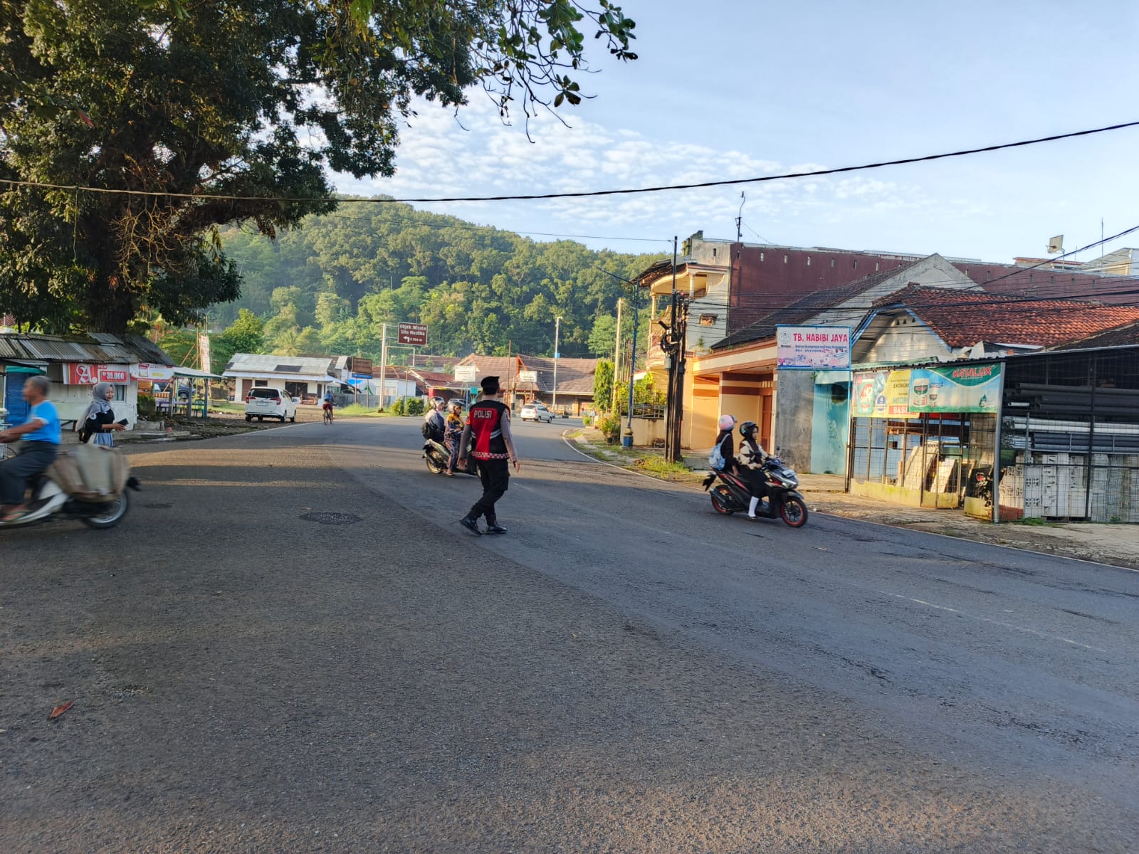 Unit PAM Obvit Polres Banjar melaksanakan pengaturan arus lalu lintas yang bertujuan untuk mengurai kendaraan di pagi hari saat warga melaksanakan aktifitas.