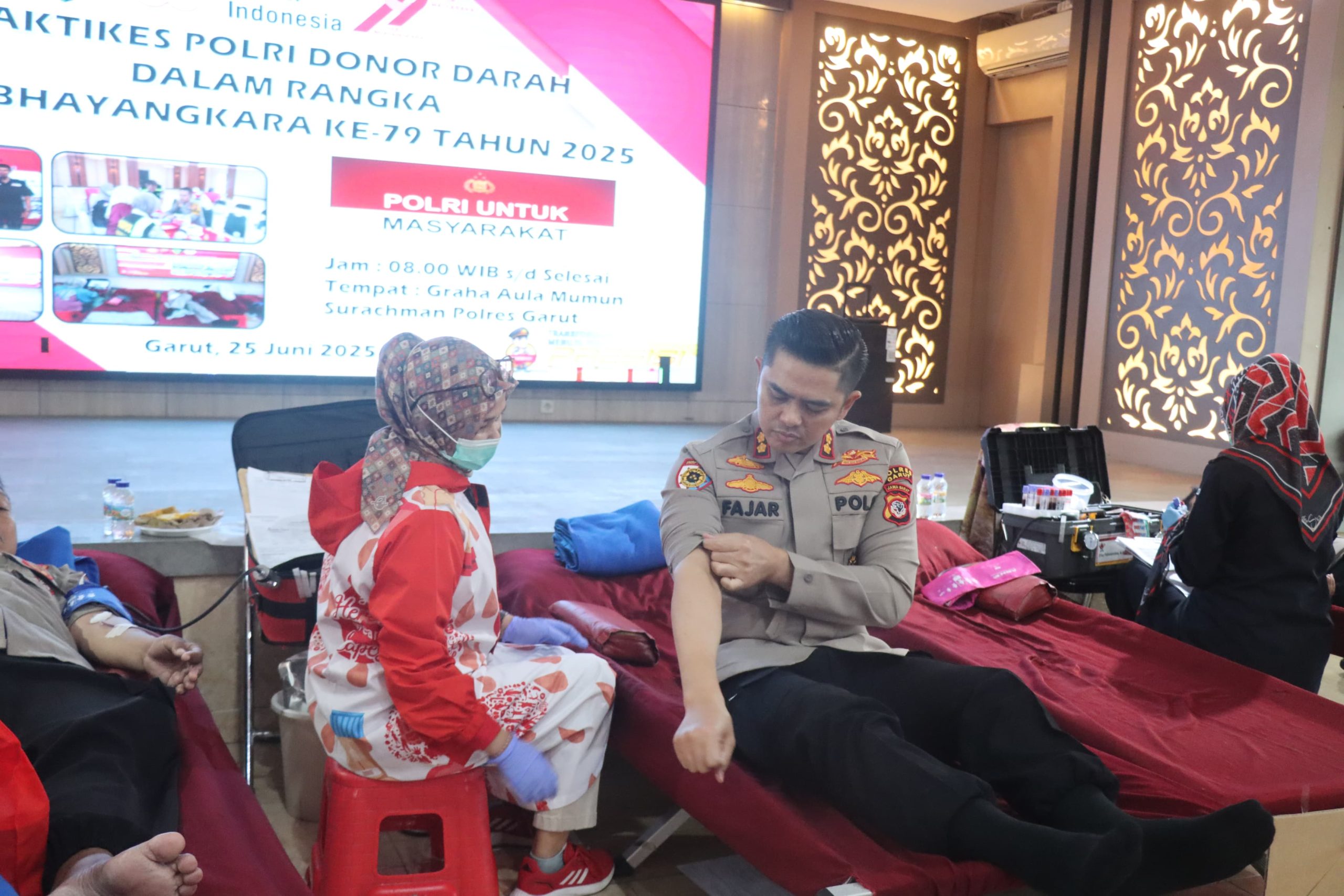 Garut – Dalam rangka memperingati Hari Ulang Tahun Bhayangkara ke-79, Polres Garut menggelar kegiatan Bakti Kesehatan Donor Darah yang berlangsung pada hari Rabu, 25 Juni 2025, mulai pukul 08.00 WIB di Aula Mumun Surachman, Mapolres Garut.Kegiatan ini merupakan wujud nyata kepedulian sosial Polri terhadap sesama, khususnya dalam mendukung ketersediaan darah bagi masyarakat yang membutuhkan. Dengan mengusung semangat “Setetes Darah, Sejuta Kehidupan”, giat donor darah ini diikuti oleh anggota Polres Garut, Bhayangkari, dan masyarakat umum.Kapolres Garut Akbp Mochamad Fajar Gemilang S.I.K., M.H., M.I.K. menyampaikan bahwa donor darah bukan hanya sebuah aksi kemanusiaan, tetapi juga cerminan dari nilai-nilai Bhayangkara sejati—rela berkorban, tangguh, dan senantiasa hadir untuk rakyat. “Kegiatan ini adalah bagian dari komitmen kami sebagai pelindung dan pelayan masyarakat. Karena darah yang kita sumbangkan hari ini, bisa menjadi harapan hidup bagi seseorang esok hari,” ujar beliau dengan penuh semangat.Pelaksanaan donor darah dilakukan dengan berkoordinasi bersama PMI Kabupaten Garut dan tim medis yang profesional, guna memastikan proses berlangsung aman, higienis, dan lancar. Para peserta tampak antusias, menunjukkan solidaritas dan keikhlasan dalam memberikan kontribusi bagi kemanusiaan.Selain menjadi bagian dari peringatan HUT Bhayangkara, kegiatan ini juga bertujuan menumbuhkan semangat gotong royong dan mempererat sinergitas antara Polri dan masyarakat dalam menciptakan lingkungan yang sehat dan peduli sesama.Dirgahayu Bhayangkara ke-79!Polri Presisi, Untuk Indonesia yang Tangguh dan Berkeadilan.(Lia/Humas Polres Garut)