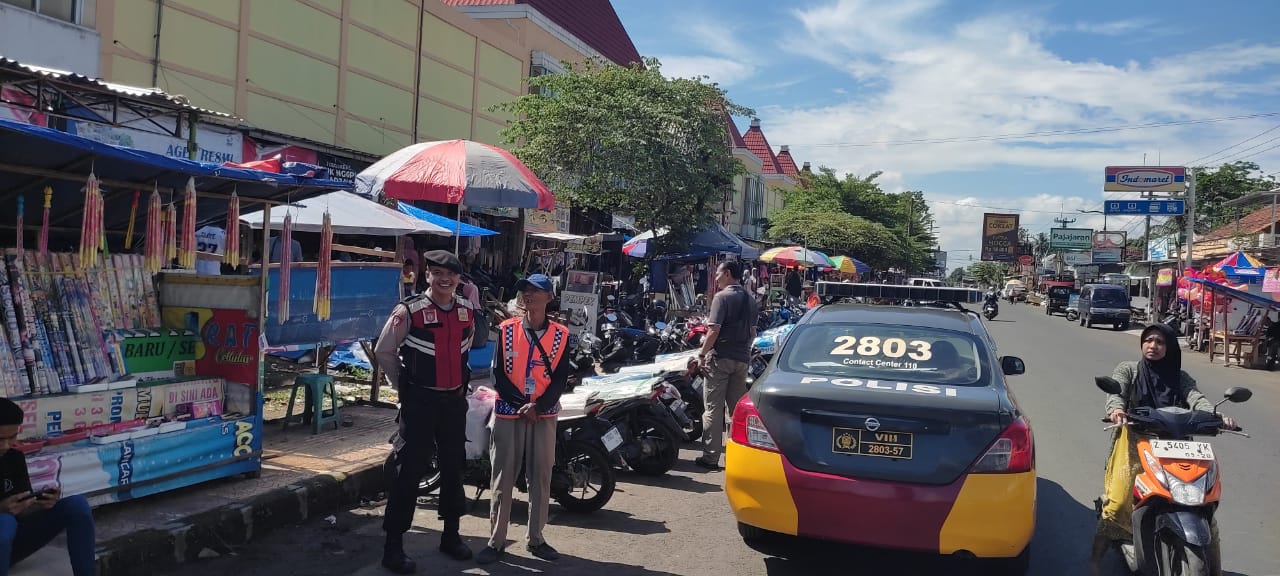 Unit Patroli samapta memberikan Himbauan Kamtibmas Kepada Petugas parkir dan penjaga Toko di pasar Bojongkantong kecamatan Langensari