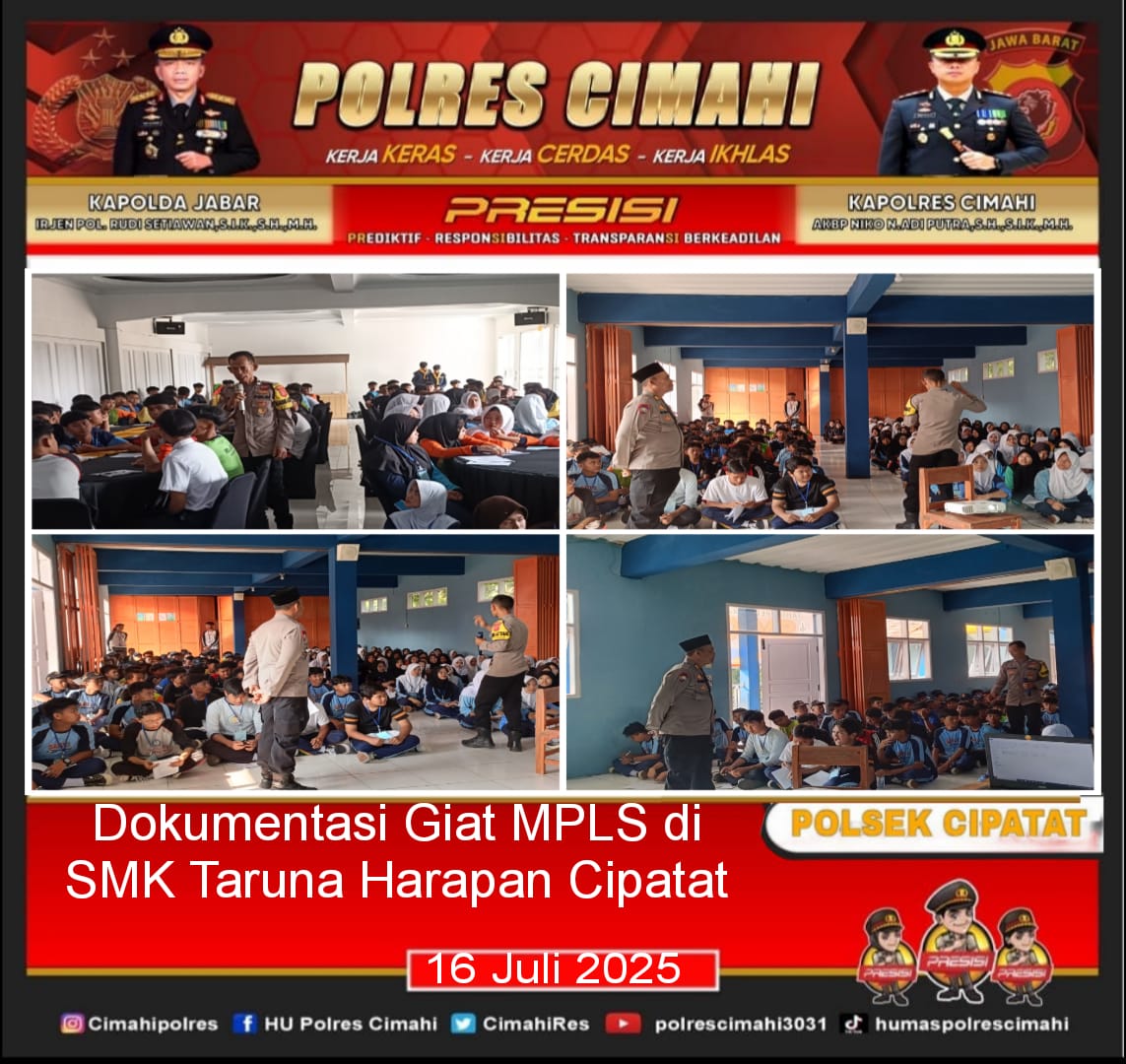 Wujud kepedulian Polri terhadap kualitas Karakter para pelajar , Polsek Cipatat gelar kegiatan Police Goes To School Polres Cimahi Dalam Rangka MPLS T.A 2025 Di SMK Taruna Harapan Bertempat di SMK Taruna Harapan I Cipatat Jl.Raya Cipatat No 28 B Ciptaharja Kec Cipatat.Rabu ( 16/07/2025)Pelaksanaan Materi dipimpin oleh Kanit Binmas Polsek Cipatat AKP Dede Rukmana.dengan didampingi Aiptu Sutrisno ( Bhabinkamtibmas Desa Ciptaharja) materi Pokok yang disampaikan oleh AKP Dede Rukmana Kanit Binmas Polsek Cipatat antara lain, Bullying/ Pencegahan Kekerasan di lingkungan Sekolah , Tertib berlalu lintas , Bahaya Narkoba dan Judi Online.Sebanyak 314 Siswa Kurang lebih yang mengikuti kegiatan MPLS TA. Berjalan tertib lancar serta kondusif