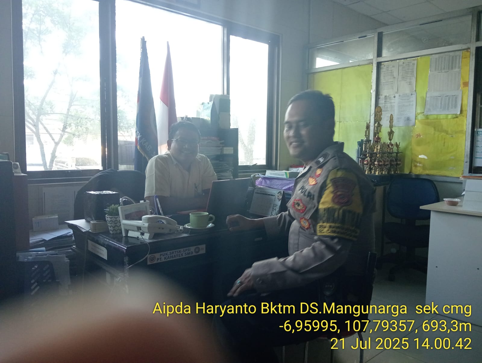 Pada hari Senin, 21 Juli 2025, pukul 14.10 WIB hingga selesai, Bhabinkamtibmas Desa Mangunarga Polsek Cimanggung, AIPDA HARYANTO, melaksanakan kegiatan sambang dan silaturahmi Kamtibmas ke kantor SPSI PT. Kahatex. Kegiatan ini merupakan bagian dari pelaksanaan program Quick Wins PRESISI dan bertempat di Dusun Cikijing, RW 01 Desa Mangunarga, Kecamatan Cimanggung, Kabupaten Sumedang. Dalam kegiatan tersebut, Bhabinkamtibmas menyampaikan berbagai pesan Kamtibmas, antara lain: – Mengajak masyarakat untuk selalu menjaga keamanan dan ketertiban lingkungan dengan berpartisipasi aktif dalam kegiatan Siskamling atau ronda malam.- Menghimbau warga bersama-sama menjaga dan mengantisipasi tindak pidana pencurian kendaraan bermotor (curanmor) serta menghindari keterlibatan dalam tindak pidana perdagangan orang.- Mengantisipasi potensi bencana alam di lingkungan sekitar, seperti banjir, pohon tumbang, dan kebakaran hutan.- Mengajak masyarakat untuk menerapkan pola hidup sehat sebagai upaya pencegahan stunting.- Meminta warga segera melaporkan kejadian penting kepada pihak terkait, seperti Kepala Desa, Bhabinkamtibmas, dan Babinsa.- Mengingatkan pentingnya bijak dalam menggunakan media sosial serta waspada terhadap penyebaran berita hoaks.- Menyampaikan bahwa masyarakat yang membutuhkan bantuan kepolisian dapat menghubungi nomor layanan darurat 110 di Polres Sumedang maupun Polsek Cisitu agar segera ditindaklanjuti terkait gangguan keamanan di lingkungan. Kegiatan berjalan dengan aman dan lancar, serta berhasil mempererat silaturahmi dan sinergi antara warga masyarakat dengan Polri.(Lia/Humas Polsek Cimanggung)