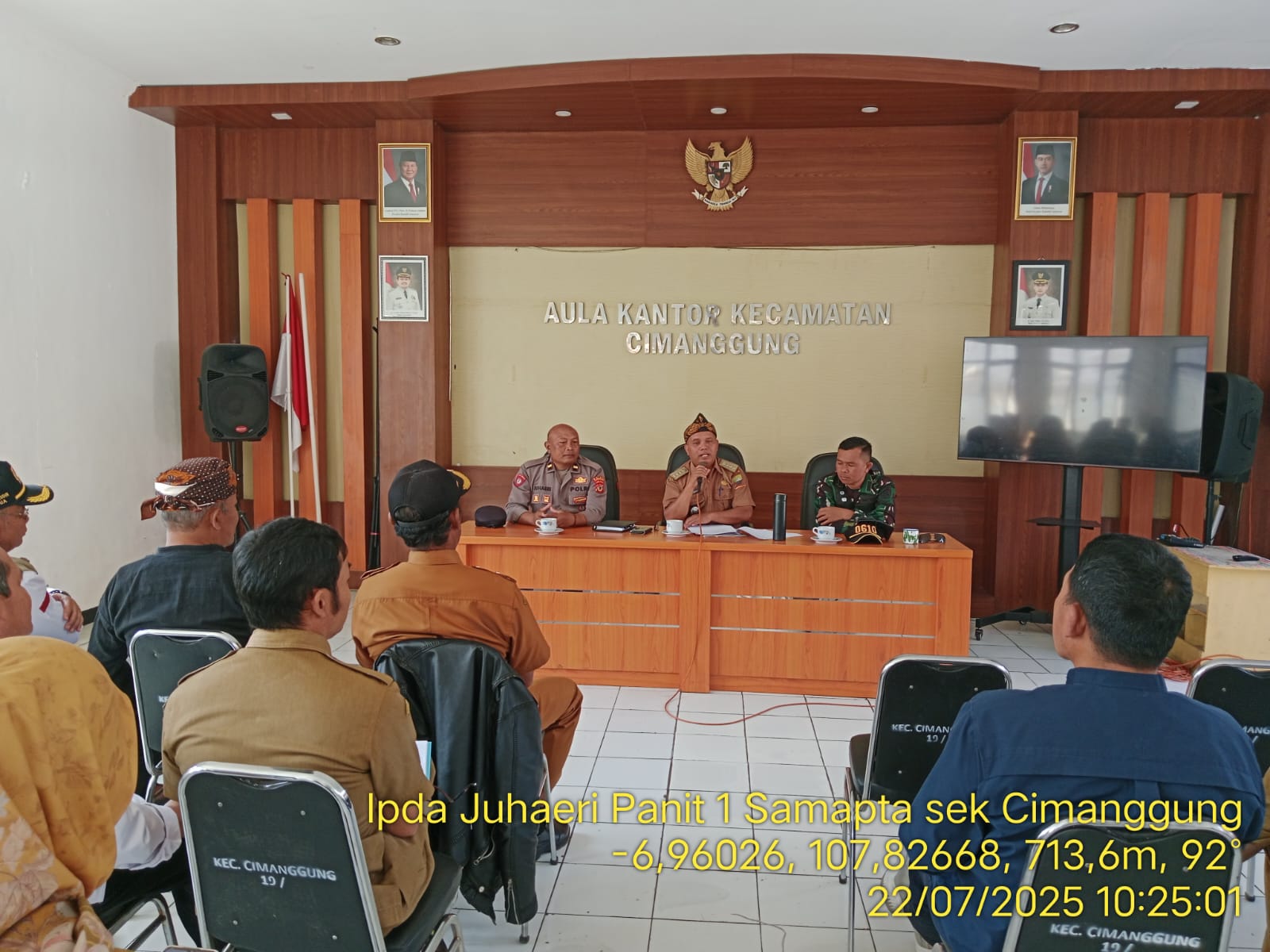 Cimanggung_Sumedang. Bertempat di Aula kantor Kecamatan Cimanggung Kabupaten Sumedang, telah dilaksanakan Giat Rapat Minggon tingkat Kecamatan Cimanggung Kabupaten Sumedang. Selasa (22/07/2025). Kegiatan tersebut dihadiri oleh :- Camat Cimanggung Drs. H. Agus Wahyudin, M.Si- Kapolsek Cimanggung Kompol Karyaman D, S.H.,M.H- Panit 1 Samapta Polsek Cimanggung IPDA JUHAERI – Kepala UPTD / UPTB se Kec. Cimanggung- Para Kepala Desa se Kec. Cimanggung- Para Ketua BPD- Aparatur Desa tiap Desa se kecamatan cimanggung.Adapun susunan acara dalam giat tersebut sbb :1. Pembukaan.2. Sambutan Camat Cimanggung 3. Pembahasan dengan materi 4. Tanya jawab dengan peserta minggon.5. Do’a dan penutup.Dalam kesempatan tersebut ada beberapa hal yg disampaikan oleh unsur Forkopimcam Cimanggung antara lain yaitu :Camat Cimanggung :- Persiapan kegiatan menjelang HUT RI ke 80 Tahun dan Milangkala Kecamatan Cimanggung Ke-39 Tahun- Panitia HUT RI agar bisa Menjaga keamanan, ketentraman dan ketertiban jelang HUT RI- Para Kepala Desa agar bisa menertibkan masyarakat nya untuk tidak melakukan pungutan di Jalan Umum- Rencana kegiatan perayaan HUT RI agar menyesuaikan dengan anggaran yang ada- Pawai Pembangunan dilaksanakan di Desa Masing-masing menyesuaikan dengan situasi dan kondisi keamanan serta ketertiban wilayah – Membangun kesadaran akan kebersihan lingkungan- Waspada cuaca yg tidak dapat diprediksi yang dapat mengakibatkan terjadinya bencana alam- Pengajuan ADD tahap II dilengkapi dengan surat pernyataan yg ditandatangani oleh Ketua BPD- Pengelolaan keuangan Desa diharapkan sesuai dengan aturan yang berlaku- Pelaksanaan kegiatan Milangkala Kecamatan Cimanggung Ke-39 disesuaikan dengan anggaran yang ada dan segera bentuk Panitia Pelaksana- Tingkatkan Siskamling diwilayah Desa Masing-masing untuk menjaga situasi Kamtibmas dan antisipasi terjadinya C3 maupun kewaspadaan terjadinya Bencana.Kapolsek Cimanggung :- Polri siap mensukseskan kegiatan HUT RI ke 80 diwilayah Kecamatan Cimanggung dan Milangkala Kecamatan Cimanggung Ke-39 – Berantas peredaran minuman keras beralkohol jelang kegiatan HUT RI sehingga dapat menekan potensi keributan / Kejahatan – Peningkatan ketertiban dan keamanan jelang pelaksanaan HUT RI dan Milangkala Kecamatan Cimanggung Ke-39 – Kasus Curanmor naik beberapa waktu terakhir, untuk itu kepada warga masyarakat diharapkan untuk bersama-sama menjaga keamanan lingkungan dengan melaksanakan Siskamling- Pemasangan CCTV di tempat-tempat rawan kejahatan agar dapat membantu pengungkapan tindak kejahatan- Peningkatan Partisipasi masyarakat dalam mengungkap kejahatan- Agar kepala desa memberikan himbauan kepada warga masyarakat nya untuk lebih waspada dan meningkatkan pengamanan swakarsa di wilayah nya masing-masing.- Terkait situasi Kamtibmas diwilayah hukum Polsek Cimanggung Polres Sumedang terutama terjadinya C3 ( Curas, Curat dan Curanmor ) untuk Bersama-sama saling menjaga keamanan dilingkungan masing-masing dengan meningkatkan partisipasi masyarakat berupa siskamling- Terkait banyak pendatang diwilayah Kecamatan Cimanggung, maka perlu dilakukan pendataan dan pengawasan serta wajib melapor kepada aparat pemerintah setempat dalam hal ini RT dan RW, untuk mencegah hal2 yang tidak diharapkan.Danramil Cimanggung- Sukseskan kegiatan HUT RI ke 80 di wilayah Kecamatan Cimanggung – Bekerjasama dalam mensukseskan Milangkala Kecamatan Cimanggung Ke-39 – Laksanakan Siskamling diwilayah RT RW dan Desa sebelum terjadinya tindak kejahatan.Kegiatan selesai pukul 11.30 Wib berjalan aman dan kondusif.Bahwa kegiatan minggon tersebut merupakan agenda rutin tiap minggu yang di laksanakan oleh aparatur pemerintahan Kec. Cimanggung dan intansi terkait dalam rangka evaluasi Kegiatan maupun kejadian selama 1 Bulan terkahir di wilayah Kecamatan Cimanggung Kabupaten Sumedang.(Lia/Humas Polsek Cimanggung)
