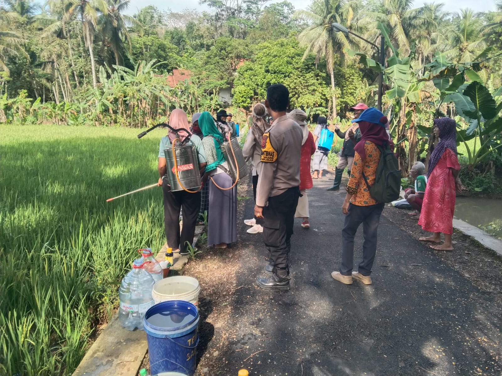 Bhabinkamtibmas mendampingi kegiatan persiapan penyemprotan lahan sawah milik petani yang tengah dilanda hama wereng. Dalam kesempatan tersebut, Bhabinkamtibmas memberikan arahan agar pelaksanaan penyemprotan dilakukan secara terkoordinasi dan sesuai dengan anjuran dari petugas penyuluh pertanian, demi menjaga kualitas hasil panen dan keamanan lingkungan sekitar.