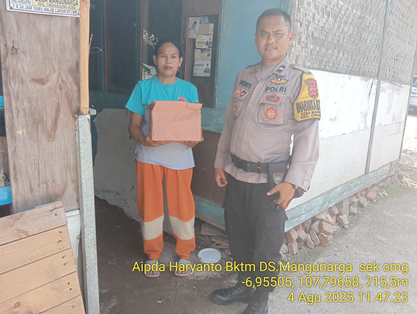 Cimanggung_Sumedang. Bhabinkamtibmas Desa Mangunarga Polsek Cimanggung Polres Sumedang AIPDA HARYANTO telah melaksanakan kegiatan silaturahmi kamtibmas sekaligus memberi sarana kontak berupa Sembako Kepada Warga an.Ibu Esih 58 th warga Rt 01/04 Desa Mangunarga Kecamatan Cimanggung Kabupaten Sumedang. Senin (04/08/2025). Adapun dalam kegiatan silaturahmi dan pemberian sarana kontak tersebut, bhabinkamtibmas menyampaikan himbauan kamtibmas, di antaranya :• Selalu waspada dengan perubahan cuaca dengan seringnya hujan yang mengakibatkan terjadinya angin puting beliung, banjir dan longsor. • Segera melapor/koordinasikan dengan bhabinkamtibmas/babinsa apabila terjadi gangguan kamtibmas di lingkungan. Kegiatan berjalan aman, terjalin silaturahmi antara warga masyarakat dengan bhabinkamtibmas.(Lia/Humas Polsek Cimanggung)