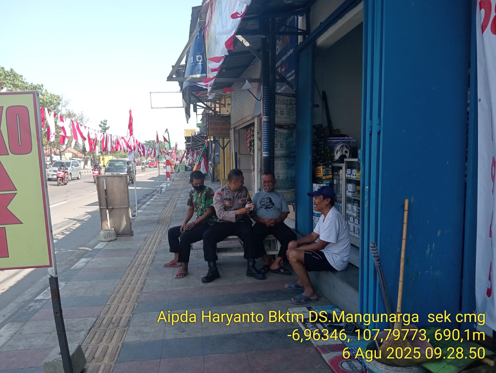 Cimanggung_Sumedang. Dalam rangka mempererat tali silaturahmi antara warga masyarakat binaan dengan bhabinkamtibmas Desa Mangunarga AIPDA HARYANTO melaksanakan giat sambang ke warga Desa Mangunarga Kecamatan Cimanggung Kabupaten Sumedang. Rabu (06/08/2025). Kegiatan tersebut di laksanakan untuk berperan aktif membantu dan menjaga situasi kamtibmas di Desa Mangunarga Kecamatan Cimanggung Kabupaten Sumedang.Kapolsek Cimanggung KOMPOL KARYAMAN D., S.H., M.H. mengatakan ” Anggota bhabinkamtibmas Desa Mangunarga melaksanakan kegiatan rutin sambang sekaligus silaturahmi agar mendekatkan diri kepada warga masyarakat wilayah desa Mangunarga.“Selain itu anggota bhabinkamtibmas juga wajib memberikan pengarahan dan edukasi kamtibmas,mempererat Tali silaturahmi, menyampaikan pesan kamtibmas, monitoring situasi kamtibmas, monitoring penerapan prokes dan mengajak warga masyarakat untuk senantiasa menjaga kondusifitas dan keamanan di lingkungannya masing-masing,” Pungkas Kapolsek Cimanggung.(Lia/Humas Polsek Cimanggung)