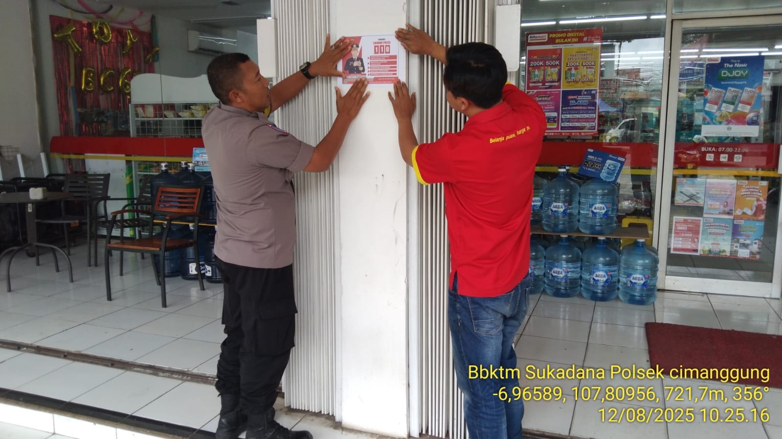 Cimanggung_Sumedang. Bhabinkamtibmas Desa Sukadana Polsek Cimanggung Polres Sumedang Polda Jabar AIPDA TRI WIDODO telah melaksanakan kegiatan Sosialisasi LAYANAN KEPOLISIAN 110 BEBAS PULSA ke Swalayan Alfamart Desa Sukadana dengan cara pijit 110 lalu pijit angka “0” untuk melaporkan. Selasa (12/08/2025). Kegiatan tersebut bertujuan untuk silaturahmi/kamtibmas ke warga masyarakat, Kegiatan sambang seperti ini dapat menjadi langkah awal dalam membangun hubungan yang erat antara kepolisian dan warga masyarakat serta diharapkan warga masyarakat dapat lebih proaktif berkordinasi dalam menjaga keamanan dan ketertiban di tengah – tengah masyarakat.Kegiatan tersebut dalam rangka menjalin silaturahmi dengan warga masyarakat selama kegiatan berjalan dengan aman tertib dan lancar.(Lia/Humas Polsek Cimanggung)