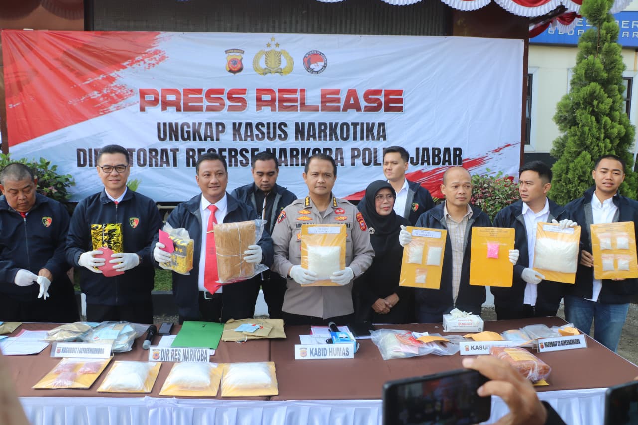 Direktorat Reserse Narkoba Polda Jawa Barat berhasil mengungkap jaringan peredaran narkotika lintas daerah Jakarta–Sukabumi–Bandung. Dalam serangkaian operasi yang dilakukan pada 7 hingga 14 Agustus 2025, Polisi mengamankan empat orang tersangka beserta barang bukti narkotika jenis sabu seberat total 7.004,86 gram dan 298 butir ekstasi.Plh Kabid Humas Polda Jabar Kombes Pol irfan N S.I.K., mengatakan bahwa pengungkapan pertama dilakukan pada 7 Agustus 2025 di Padalarang, Kabupaten Bandung Barat. Polisi menangkap tersangka berinisial H yang kedapatan membawa lima bungkus sabu dengan berat bruto lebih dari 5 kilogram di bagasi motor yang dikendarainya. Dari hasil pemeriksaan, barang haram tersebut diketahui milik seorang bandar berinisial Antoni (DPO).Selanjutnya, pada 9 Agustus 2025, tim menangkap tersangka N di wilayah Cikole, Kota Sukabumi dengan barang bukti sabu seberat 1,7 kilogram. Beberapa hari kemudian, pada 13–14 Agustus 2025, dua tersangka lain berinisial E dan A diamankan di Ngamprah, Kabupaten Bandung Barat, serta di Cibeureum, Kota Sukabumi. Dari keduanya, polisi menyita sabu hampir 200 gram, ekstasi sebanyak 298 butir, serta tambahan sabu seberat 8 gram di kontrakan milik tersangka E.Adapun modus operandi para pelaku adalah mengedarkan sabu dan ekstasi di wilayah Jawa Barat dengan sistem tempel maupun perantara. Tersangka E diketahui bertugas sebagai kurir dengan imbalan Rp. 3 juta per sekali pengambilan, sementara tersangka A berperan sebagai sopir.Direktur Reserse Narkoba Polda Jabar Kombes Pol. Albert RD., S.Sos., S.I.K., M.Si mengungkapkan bahwa Total barang bukti sabu yang berhasil disita setara dengan 35.024 jiwa yang terselamatkan dari penyalahgunaan narkoba, dengan asumsi satu gram sabu digunakan oleh lima orang. Para tersangka dijerat Pasal 114 ayat (2) jo Pasal 112 ayat (2) UU RI Nomor 35 Tahun 2009 tentang Narkotika, dengan ancaman pidana maksimal hukuman mati atau penjara seumur hidup serta denda hingga Rp10 miliar.(Lia/Humas Polda Jabar)
