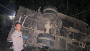 Garut – Sebuah kecelakaan lalu lintas tunggal terjadi di tanjakan Jalan Parungjawa, Desa Kadongdong, Kecamatan Banjarwangi, Kabupaten Garut, pada Minggu (24/8/2025) sekitar pukul 17.30 WIB. Peristiwa ini menimpa sebuah truk dengan nomor polisi T 8922 DP yang dikemudikan oleh Idad (23), warga Kampung Cijeruk, Desa Singajaya, Kecamatan Singajaya.Truk bermuatan pupuk kandang tersebut mengalami patah as roda saat melaju di tanjakan. Akibatnya, kendaraan kehilangan kendali, rem tidak berfungsi, dan akhirnya mundur hingga terjungkal ke sisi kiri jalan. Beruntung, sang sopir selamat tanpa mengalami luka.Kapolsek Banjarwangi, IPDA Ipar Suparlan, S.E., menjelaskan bahwa pihaknya segera merespons laporan masyarakat yang masuk melalui telepon. Petugas kemudian mendatangi lokasi kejadian, melakukan pengecekan terhadap kondisi pengemudi, mengamankan barang bawaan, serta mencari keterangan saksi.“Alhamdulillah tidak ada korban jiwa dalam kejadian ini, hanya kerugian materil yang saat ini masih dalam perhitungan,” kata Kapolsek.“Setelah upaya evakuasi menggunakan alat tekel, saat ini kendaraan berhasil dievakuasi dan situasi di lokasi sudah kembali kondusif.” Tambah Kapolsek.(Lia/Humas Polres Garut)