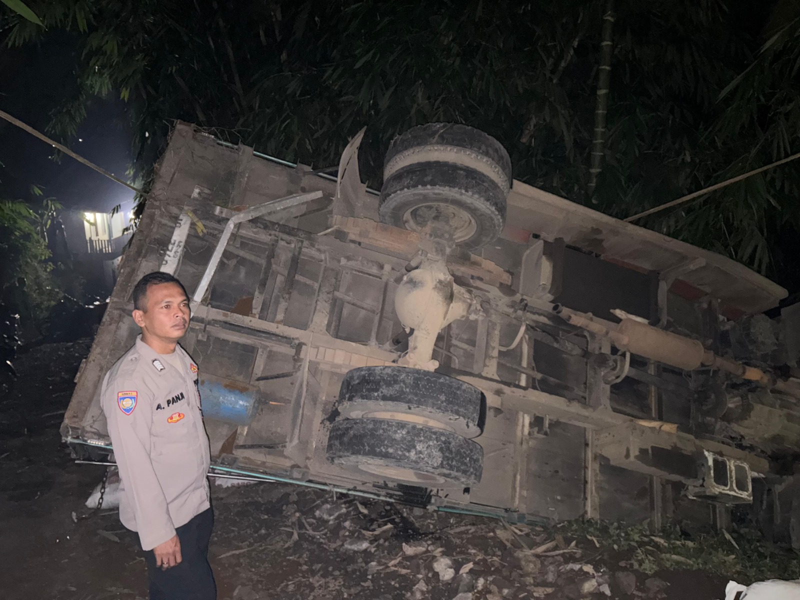 Garut – Sebuah kecelakaan lalu lintas tunggal terjadi di tanjakan Jalan Parungjawa, Desa Kadongdong, Kecamatan Banjarwangi, Kabupaten Garut, pada Minggu (24/8/2025) sekitar pukul 17.30 WIB. Peristiwa ini menimpa sebuah truk dengan nomor polisi T 8922 DP yang dikemudikan oleh Idad (23), warga Kampung Cijeruk, Desa Singajaya, Kecamatan Singajaya.Truk bermuatan pupuk kandang tersebut mengalami patah as roda saat melaju di tanjakan. Akibatnya, kendaraan kehilangan kendali, rem tidak berfungsi, dan akhirnya mundur hingga terjungkal ke sisi kiri jalan. Beruntung, sang sopir selamat tanpa mengalami luka.Kapolsek Banjarwangi, IPDA Ipar Suparlan, S.E., menjelaskan bahwa pihaknya segera merespons laporan masyarakat yang masuk melalui telepon. Petugas kemudian mendatangi lokasi kejadian, melakukan pengecekan terhadap kondisi pengemudi, mengamankan barang bawaan, serta mencari keterangan saksi.“Alhamdulillah tidak ada korban jiwa dalam kejadian ini, hanya kerugian materil yang saat ini masih dalam perhitungan,” kata Kapolsek.“Setelah upaya evakuasi menggunakan alat tekel, saat ini kendaraan berhasil dievakuasi dan situasi di lokasi sudah kembali kondusif.” Tambah Kapolsek.(Lia/Humas Polres Garut)