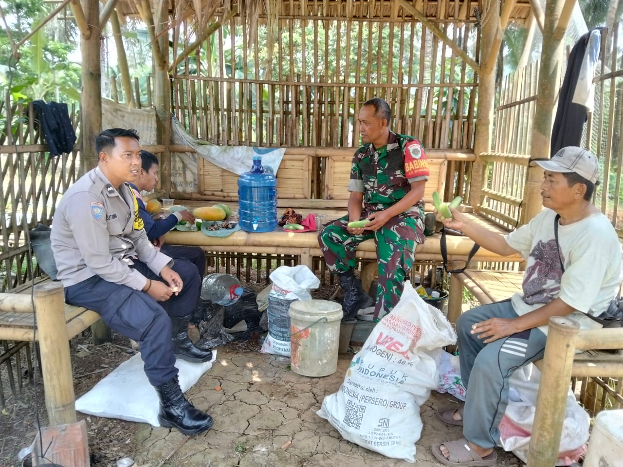Kegiatan yang berlangsung di saung pertanian tersebut diwarnai dengan suasana keakraban. Bhabinkamtibmas dan Babinsa berbincang santai bersama warga membahas berbagai hal terkait situasi lingkungan, keamanan, serta kehidupan sosial masyarakat setempat.