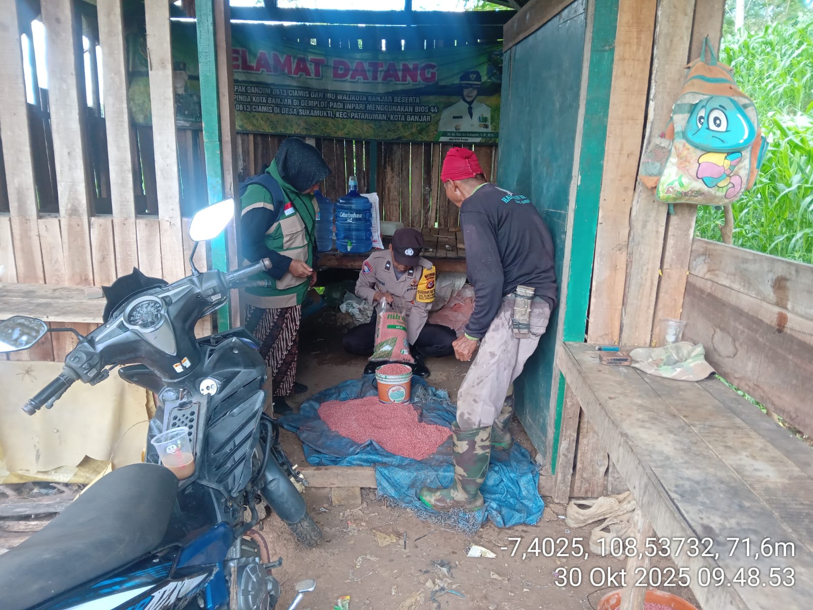 Di sela-sela kegiatan, Bhabinkamtibmas berinteraksi dan berdialog ringan dengan petani, menyerap berbagai informasi terkait kondisi pertanian serta situasi lingkungan di wilayah Desa Sukamukti. Kegiatan berlangsung santai namun penuh makna, mencerminkan kedekatan antara aparat kepolisian dan masyarakat desa.