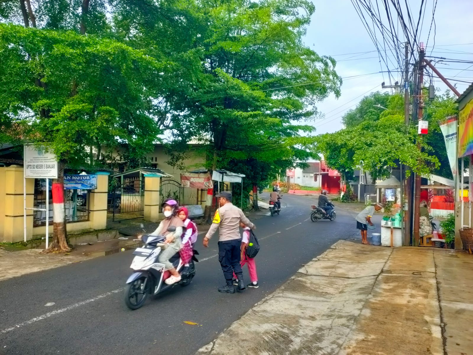 Beri Rasa Aman dan nyaman bagi Masyarkat Polsek Banjar lakukan pengaturan Di Jam Rawan Pagi di persimpangan maupun depan sekolah