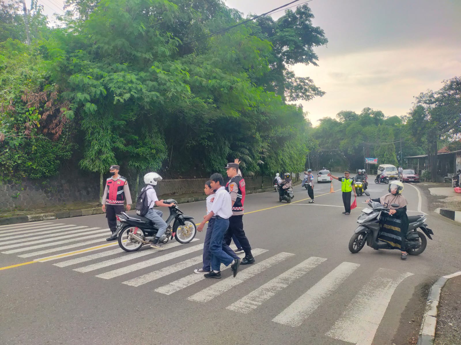 Di bawah pengawasan Wakapolsek Purwaharja IPTU Hermawan, S.Pd.I, para personel tampak sigap mengatur arus lalu lintas yang padat akibat jam masuk sekolah. Aipda Wahyu bersama Brigpol Dewi Astuti dan Brigpol Risca Widia berdiri di depan sekolah untuk membantu menyeberangkan siswa dan mengurai kepadatan kendaraan orang tua yang mengantar anak.