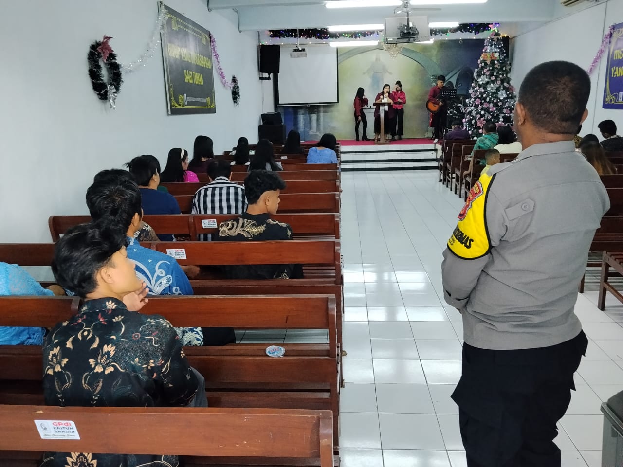 Banjar -Personil Polsek Banjar Polres Banjar melaksanakan pengamanan kegiatan kebaktian di Gereja Pantecosta Jaga kondusifitas Keamanan saat beribadah berlangsung.