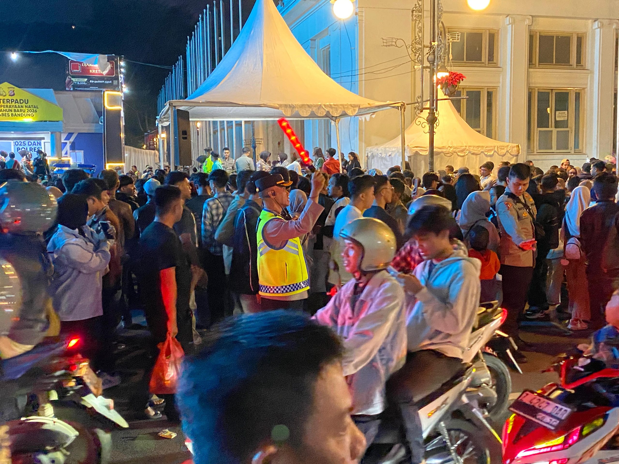 Personel Polisi Lalu Lintas (Polantas) melaksanakan kegiatan public address di sepanjang Jalan Asia Afrika, Kota Bandung, pada malam pergantian Tahun Baru 2025 menuju 2026. Kegiatan ini bertujuan untuk menginformasikan kepada masyarakat mengenai peran Polri dalam menjaga keamanan, keselamatan, ketertiban, dan kelancaran lalu lintas (kamseltibcarlantas) selama perayaan malam Tahun Baru.