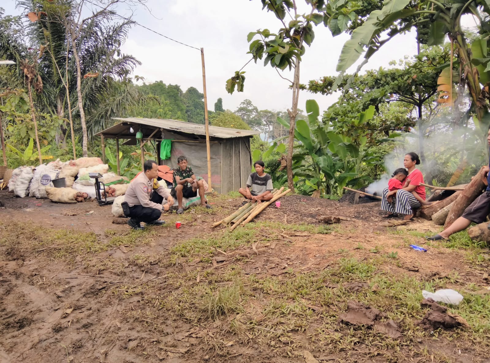 Dalam kunjungannya, Aipda Ibnu Hasyim menyambangi langsung rumah sekaligus tempat usaha milik Ibu Eni, pengrajin arang kayu bakar yang telah lama menekuni usahanya. Dialog hangat pun terjalin, membahas aktivitas produksi, kondisi lingkungan sekitar, serta situasi keamanan di wilayah tersebut.