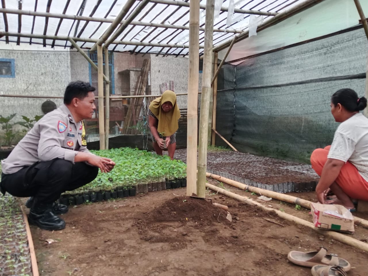 Kehadiran Bhabinkamtibmas bukan sekadar kunjungan biasa. Ia tampak berdialog hangat dengan Ibu Yati dan warga lainnya yang sedang telaten mengisi polybag, menata tanah, serta menyiapkan bibit untuk ditanam. Suasana penuh keakraban dan kekeluargaan terasa, mencerminkan kedekatan antara aparat kepolisian dengan masyarakat di desa binaannya.