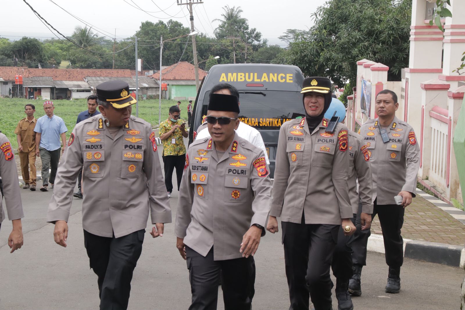 Kapolda Jawa Barat Irjen Pol. Dr. Rudi Setiawan, S.I.K., S.H., M.H., didampingi para Pejabat Utama (PJU) Polda Jabar beserta Kapolres Majalengka AKBP Rita Suwadi, S.H., S.I.K., M.M., menyambut kedatangan Kepala Kepolisian Negara Republik Indonesia (Kapolri) di lapangan sepak bola Desa Tenjolayar, Kecamatan Cigasong, Kabupaten Majalengka.(23/2/2026)