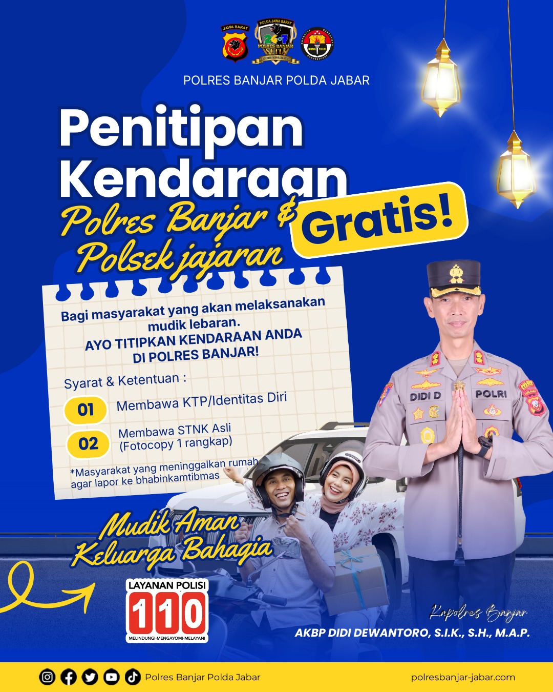 “Polres Banjar membuka layanan penitipan kendaraan bagi masyarakat yang akan melaksanakan mudik Hari Raya Idulfitri 1447 H. Kendaraan roda dua maupun roda empat dapat dititipkan di Mako Polres Banjar agar masyarakat merasa lebih tenang saat meninggalkan rumah,” ujar Kapolres Banjar.