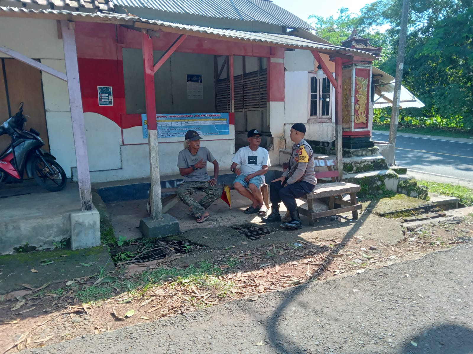 Di lokasi itu, Bhabinkamtibmas juga berdialog dengan warga yang kerap membantu mengatur arus kendaraan dan menyeberangkan masyarakat di jalan tersebut, atau yang biasa dikenal dengan sebutan “pak ogah”. Percakapan berlangsung santai dengan membahas aktivitas sehari-hari mereka dalam membantu kelancaran kendaraan di titik persimpangan tersebut.