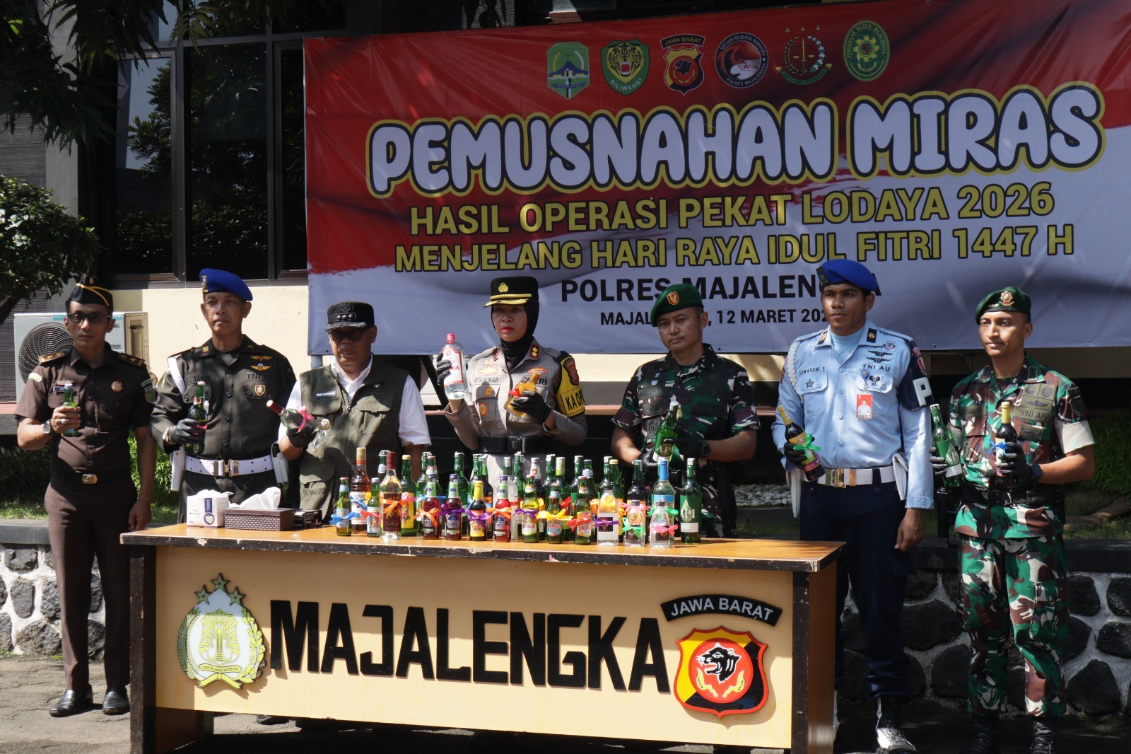 Majalengka, Segera setelah pelaksanaan Apel Gelar Pasukan Operasi Ketupat Lodaya 2026, Polres Majalengka melanjutkan agenda penting berupa pemusnahan ribuan botol minuman keras (miras) berbagai merk di halaman Mapolres Majalengka pada Kamis (12/3/2026). Kegiatan ini dipimpin langsung oleh Kapolres Majalengka AKBP Rita Suwadi, S.H., S.I.K., M.M., dengan didampingi oleh Bupati Majalengka Drs. H. Eman Suherman, M.M., Dandim 0617/Majalengka Letkol Inf. Fahmi Guruh Rahayu, S.I.P., M.I.P., serta unsur Forkopimda Kabupaten Majalengka lainnya yang turut hadir dalam rangkaian acara tersebut.