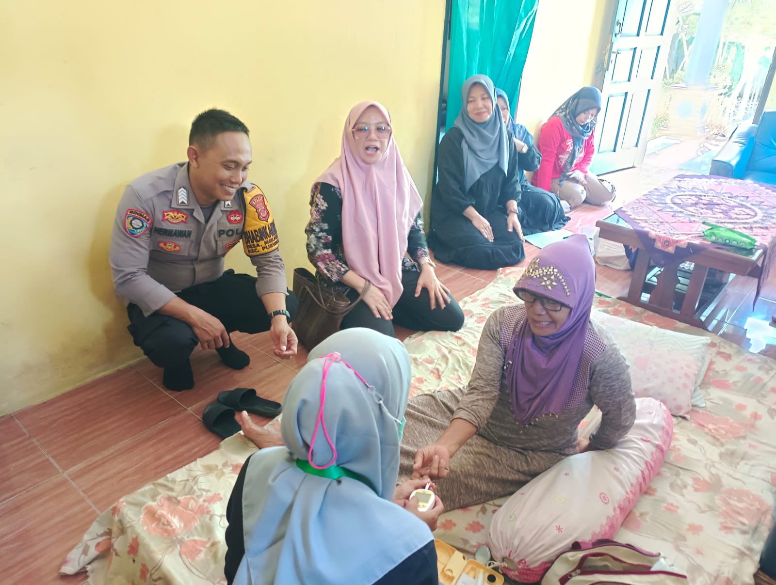 Bripka Hermawan, S.IP., melaksanakan silaturahmi door to door dengan menyasar warga yang sakit dan kurang mampu. Dalam kegiatan tersebut, bantuan sembako disalurkan sekaligus dilakukan pemeriksaan kesehatan langsung di lingkungan tempat tinggal warga.
